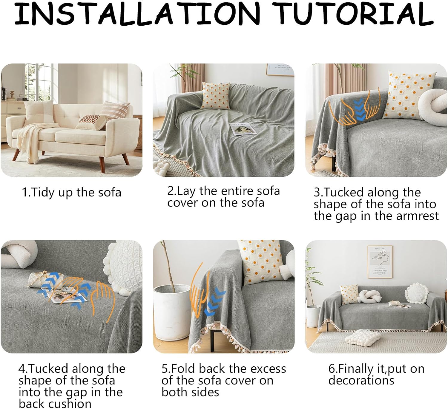 HANDONTIME Couch Slipcovers for Sofas - Dark Grey Boho Pet Couch Protector with Tassel - Chenille Herringbone 3 Seat Cover, 91" X150
