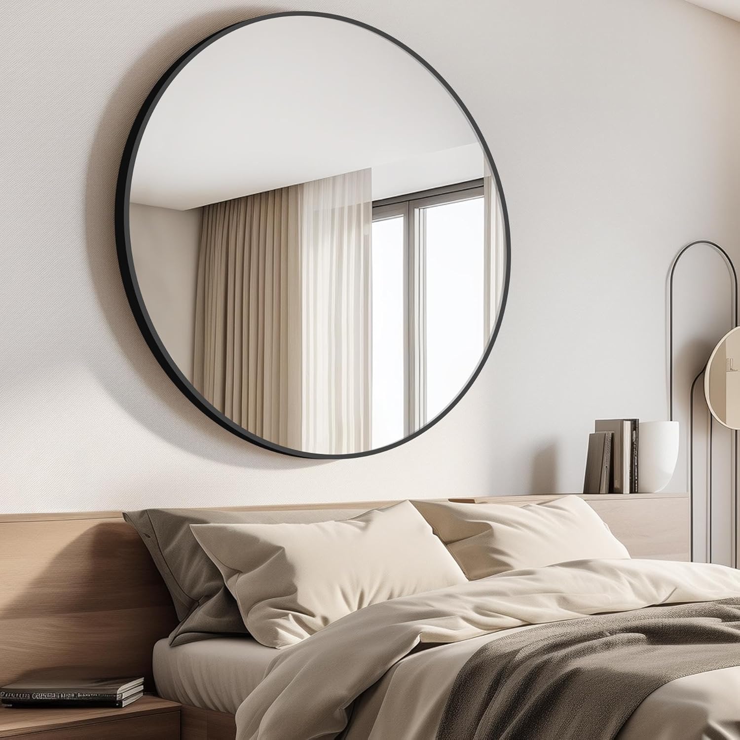 - SAFE AND EASY TO INSTALL: This black round mirror features an smooth round design that adds a soft aesthetic to the space. Our round wall mirror comes with wall mounting hardware and pre-installed hooks for hanging. Easy to install by following the installation instructions.