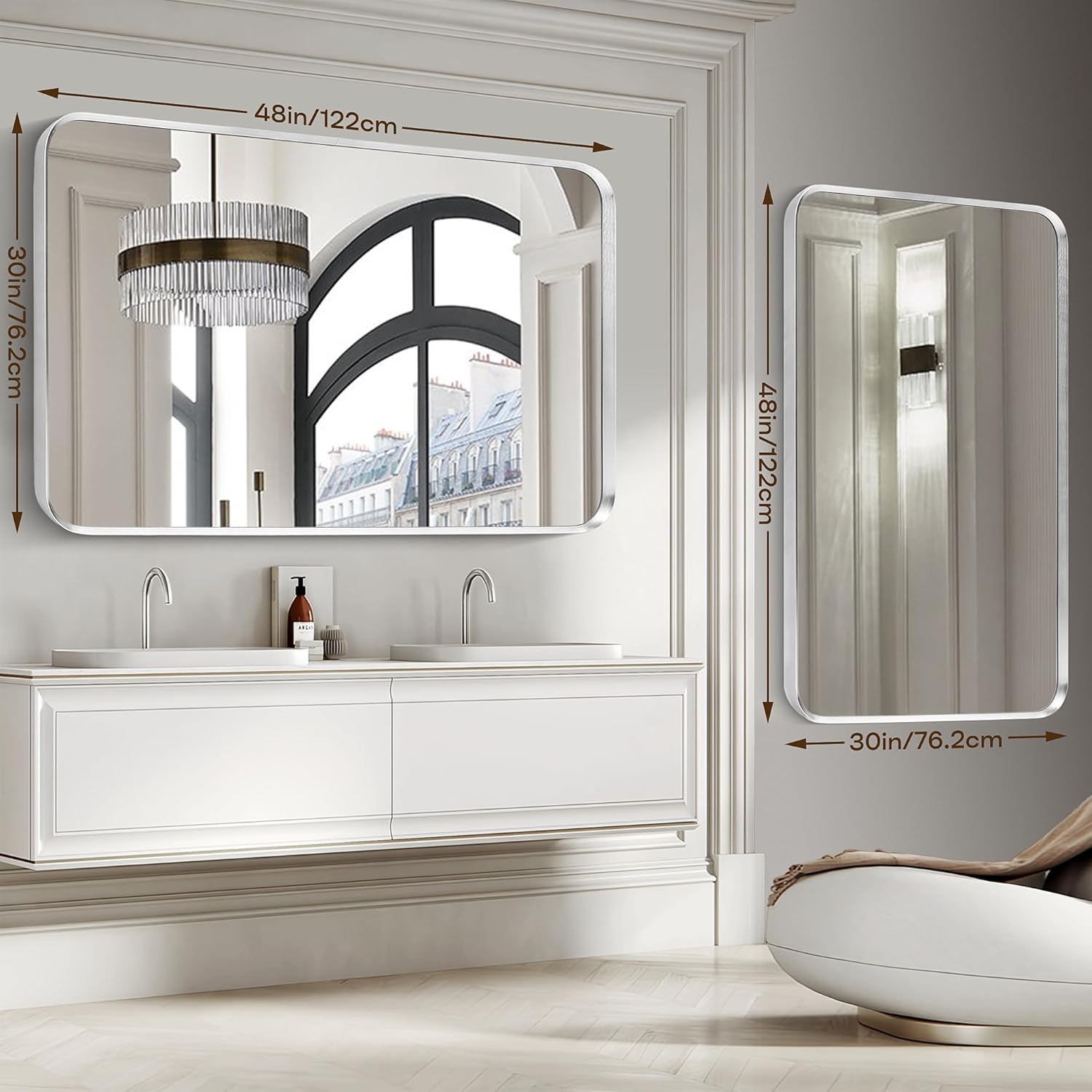 Brushed Nickel Bathroom Wall Mirror, Silver Metal Framed Large Rounded Corner Rectangle Mirror, Tempered Glass, Shatter Proof, Hangs Horizontally or Vertically (30" x 48", Silver)