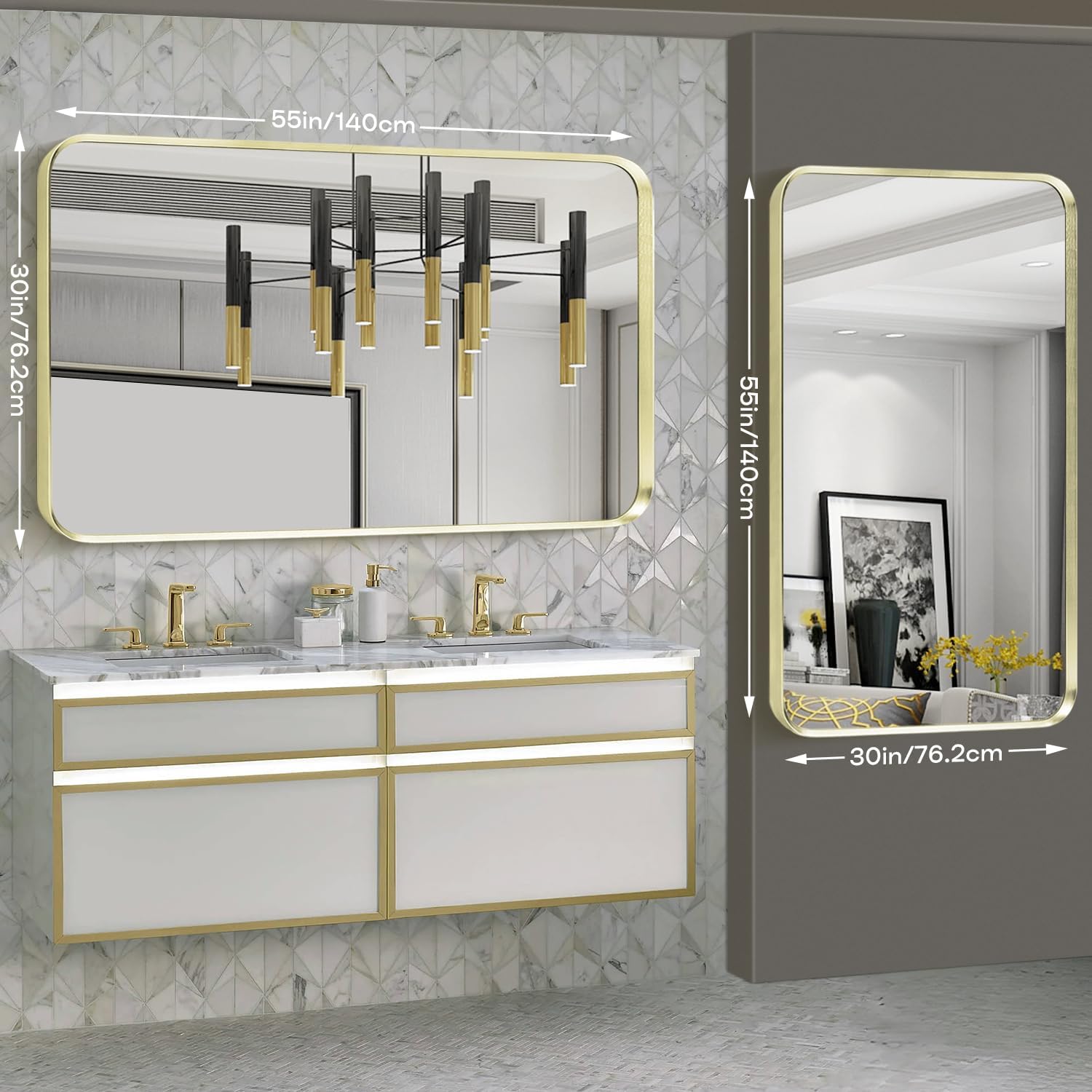 Gold Metal Framed Bathroom Mirror for Wall, Large Brushed Gold Rounded Corner Rectangular Bathroom Vanity Mirror, Anti-Rust, Tempered Glass, Hangs Horizontally or Vertically (30" x 55", Gold)