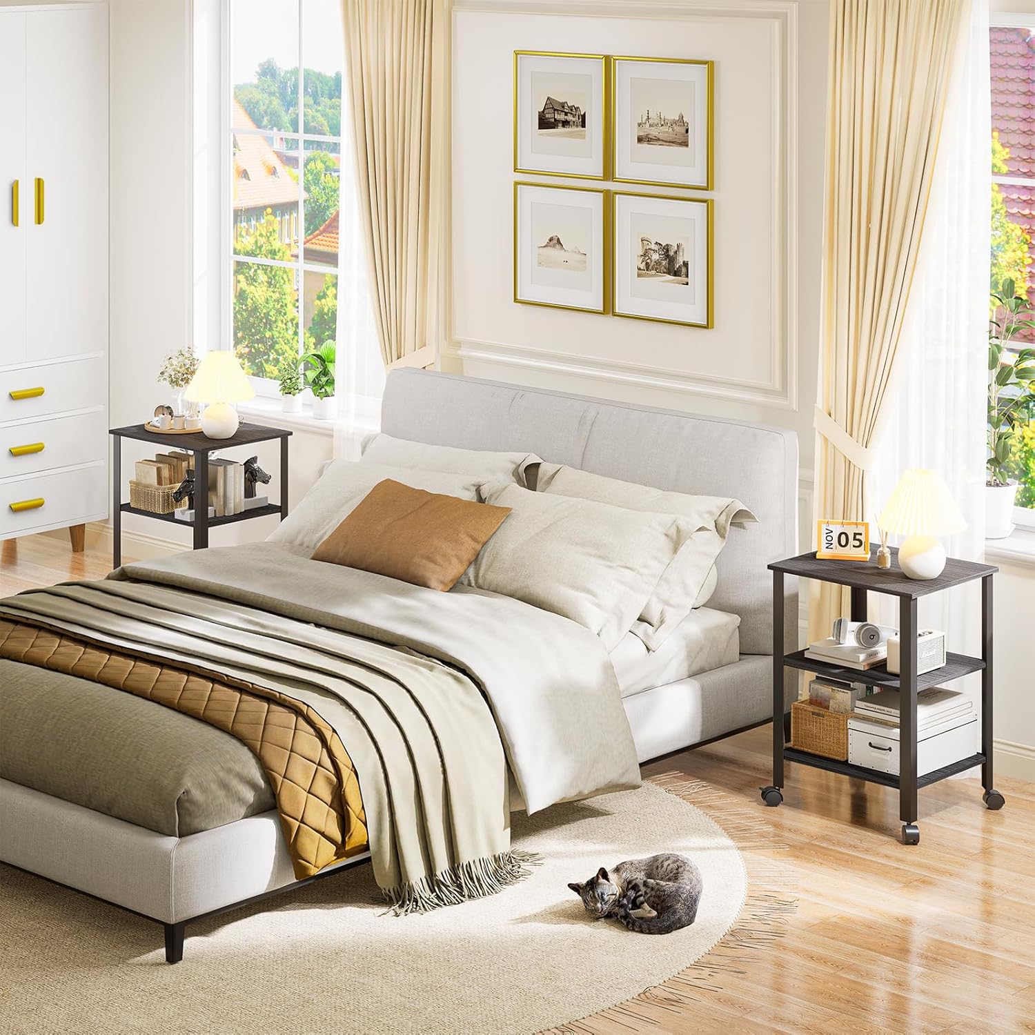 Side Table, End Table with Wheels, Printer Stand with 3-Tier Storage, Bedside Table, Bedroom, Office, Kitchen, Metal Frame, Easy Assembly -Grey