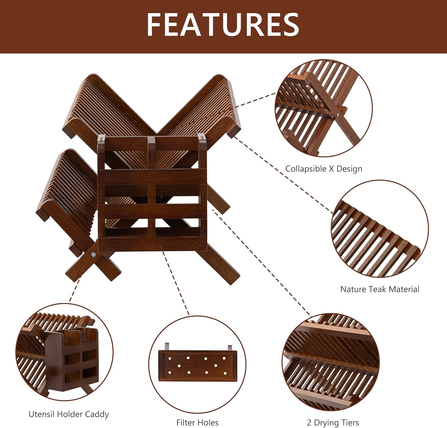 - UTENSIL HOLDER- The 2-section utensil caddy can hold flatware and cooking utensils. It is convenient to hang from the teak wood dish rack with metal clips. Filter holes on the bottom drain the water effectively.