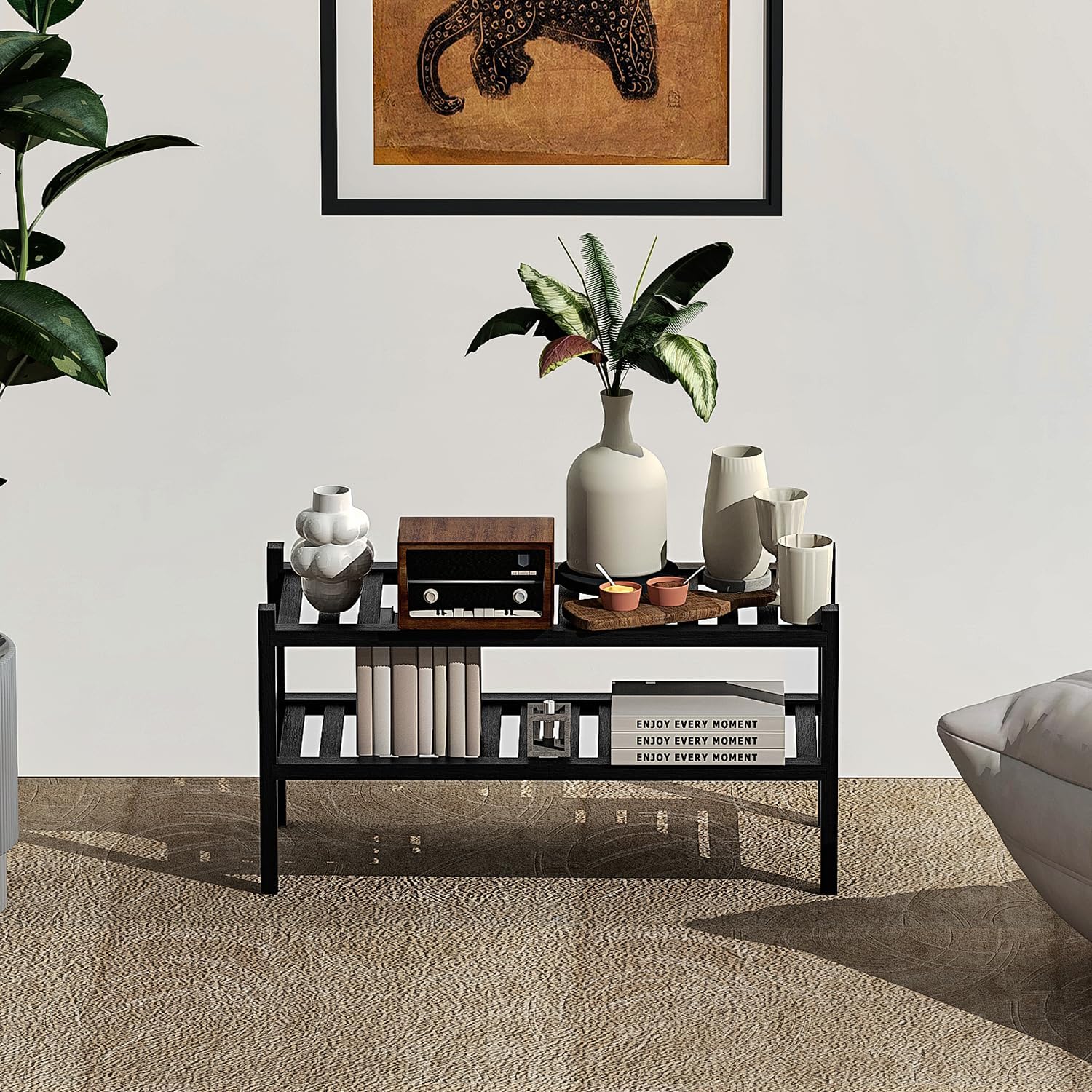 Shoe Rack 2-Tier Organizer-Stackable Storage Shelf with Multi-Function Combinations-Free Standing Bamboo Shoe Racks for Closet,Entryway,Hallway,Bathroom,Living Room Shoe Organization (Black, 2-Tier)