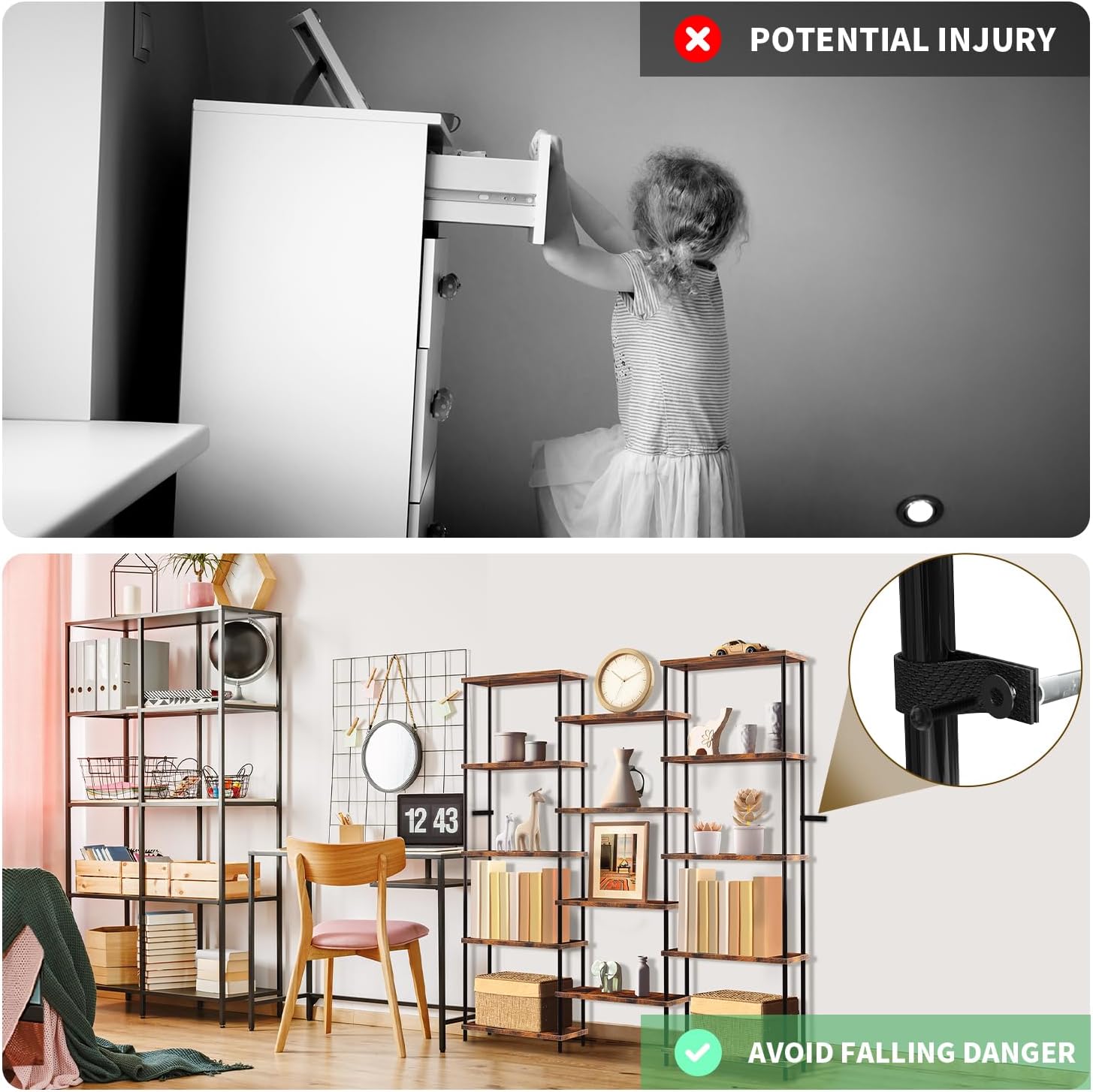 - [Humanized design]: Bookcase Tipover Resistance Device prevent the bookshelf from toppling or wobbling which enhance the stability, 8 plastic feet under the legs can be adjusted to accommodate the uneven floor and protect your floors from damage.