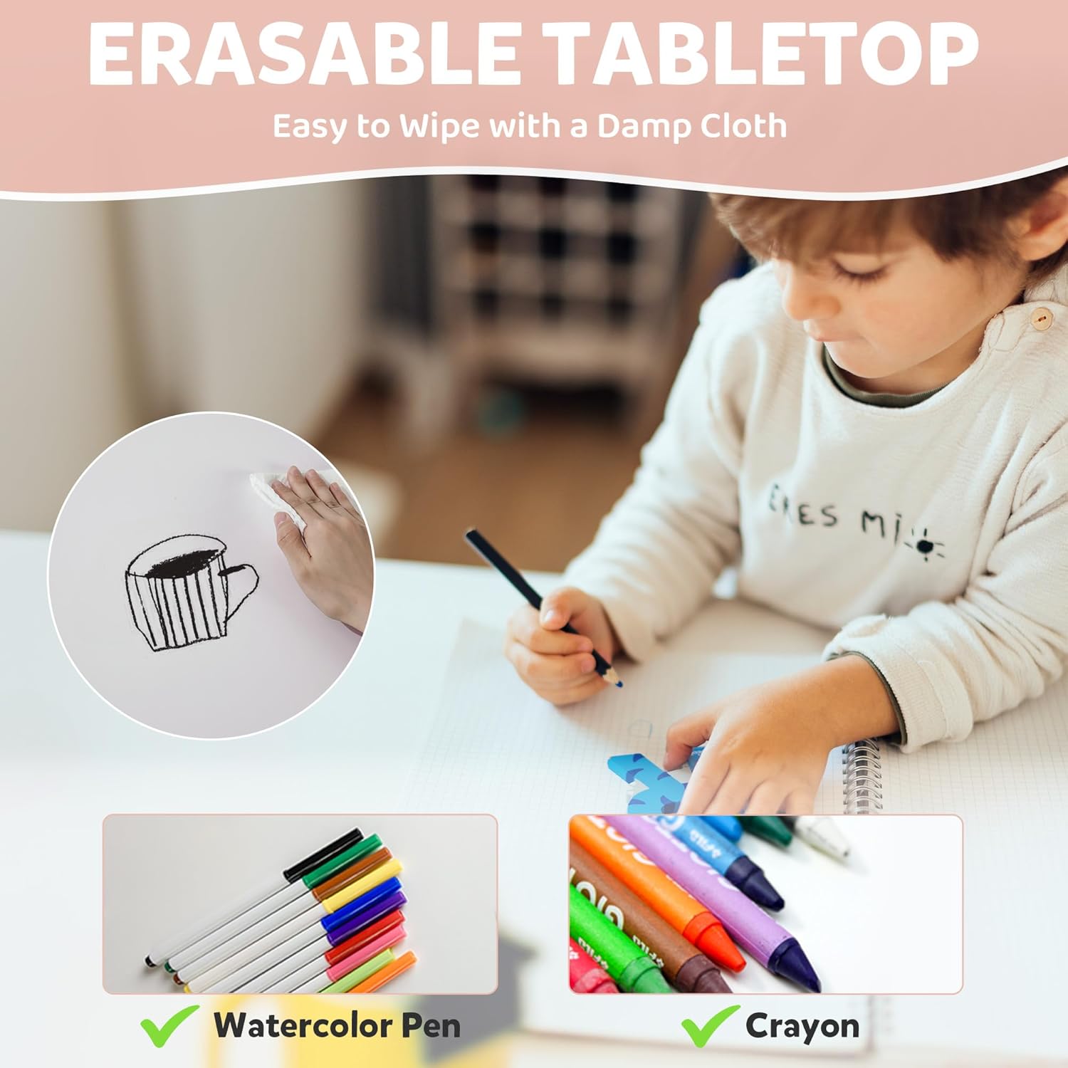 - Parent-Approved Safety & Stress-Free Cleanup: Certified safe with ASTM/CPSC-compliant materials, our thickened plastic design features rounded corners and a tip-resistant base that survives playdates. The magic-erase surface laughs off Play-Doh, juice spills, and Water-based pen - just wipe and go! Rigorously tested to exceed US children's furniture safety standards