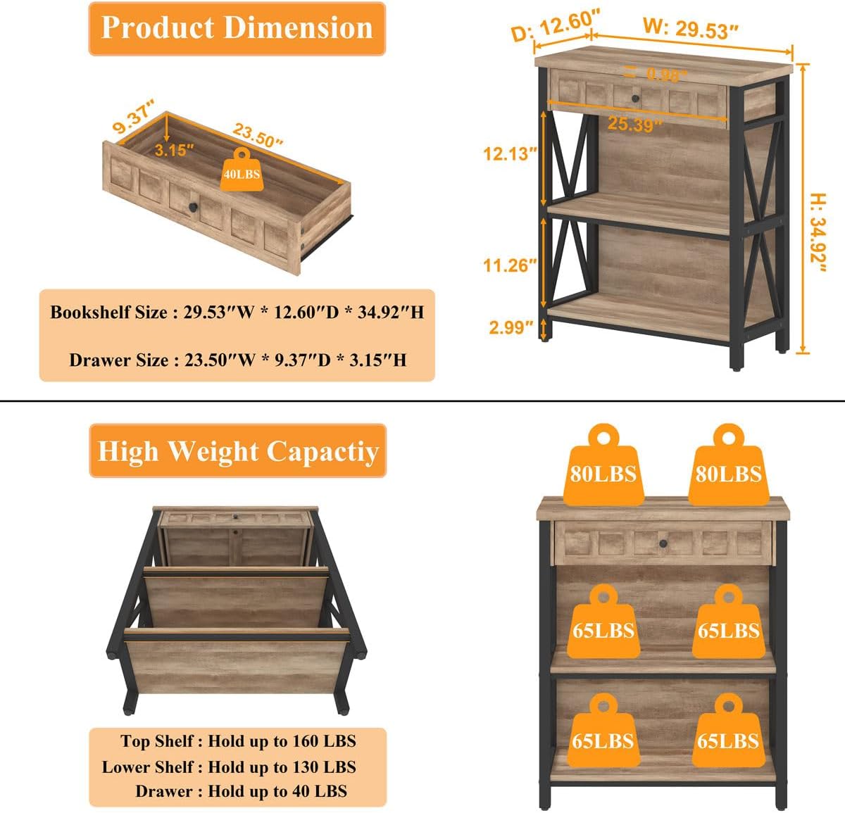 - [3 Tier Bookshelf with Drawer] This versatile bookcase not only functions as a place to store your books but also features a convenient drawer for tidily organizing smaller items. It offers an ideal solution to maintain a clean, organized, and easily accessible room. The minimalist design ensures it seamlessly fits into various spaces, be it the living room, entryway, or office. Effectively conceal clutter while infusing your space with a touch of rustic farm charm