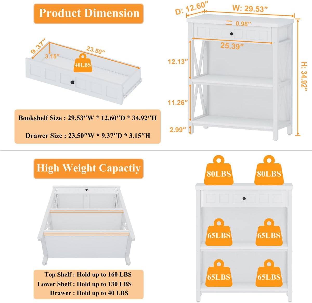 - [Impressive Stability & Weight Capacity] Thanks to additional support rods under lower shelf, this low bookshelf stands stable and secure after assembly. The weight limit of the shelf top is 160 lbs, and the lower shelf is 130 lbs. The drawer can handle up to 40 lbs. We have also added adjustable levelers on each leg to achieve perfect flatness