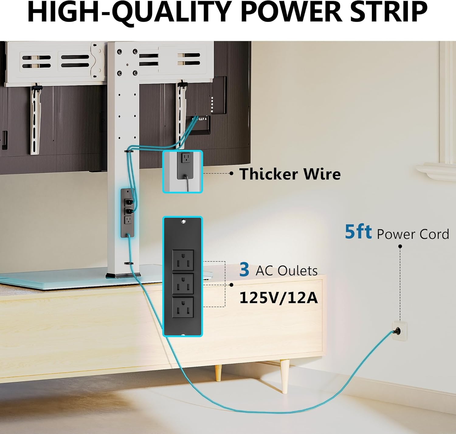 - TABLETOP TV STAND with POWER OUTLETS(ETL Certified) - We gathered a lot of market data and customer experience to launch this TV stand mount with Power Outlets. FITUEYES television stands features a built-in power outlet with 3 AC outlets (125V/12A), and a 5 ft power cord(Thicker Wire). Cable management on the back of the tv stand mount keeps your wires in place, stay away from entangled troubles