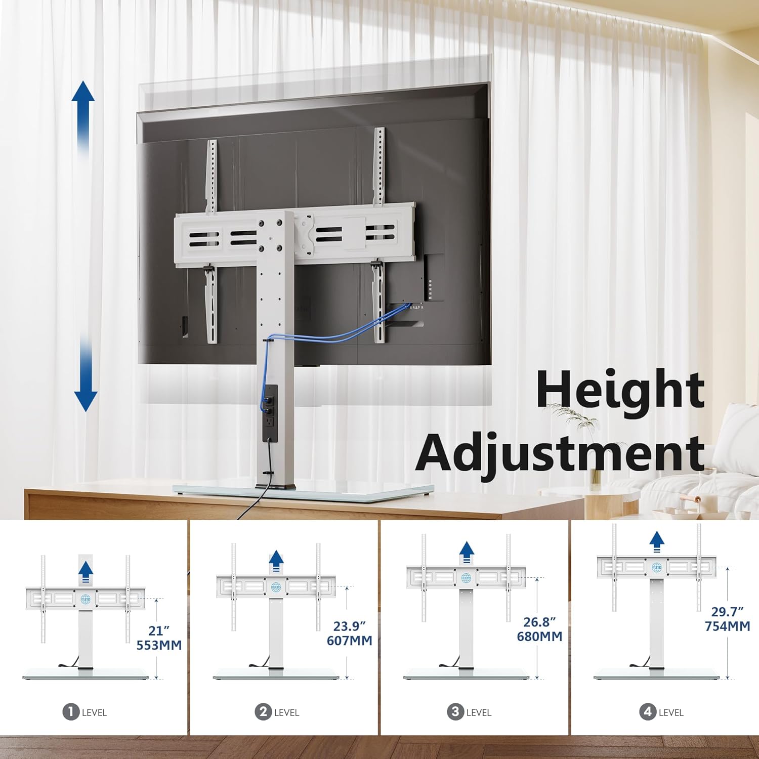 - 12 HEIGHT ADJUSTMENT & 80°SWIVEL - FITUEYES TV stand with swivel mount allows you to pivot TV 40° left/ right, getting better viewing. FITUEYES TV stand supports 4×3 levels of height adjustment. Its height adjusting range is 31.2” to 43.9”. The black TV stand pole had 4 heights (74mm each level) for adjusting while the panel bracket has 3 heights (50mm each level). You'll get better viewing whether you're sitting, lying down, or standing