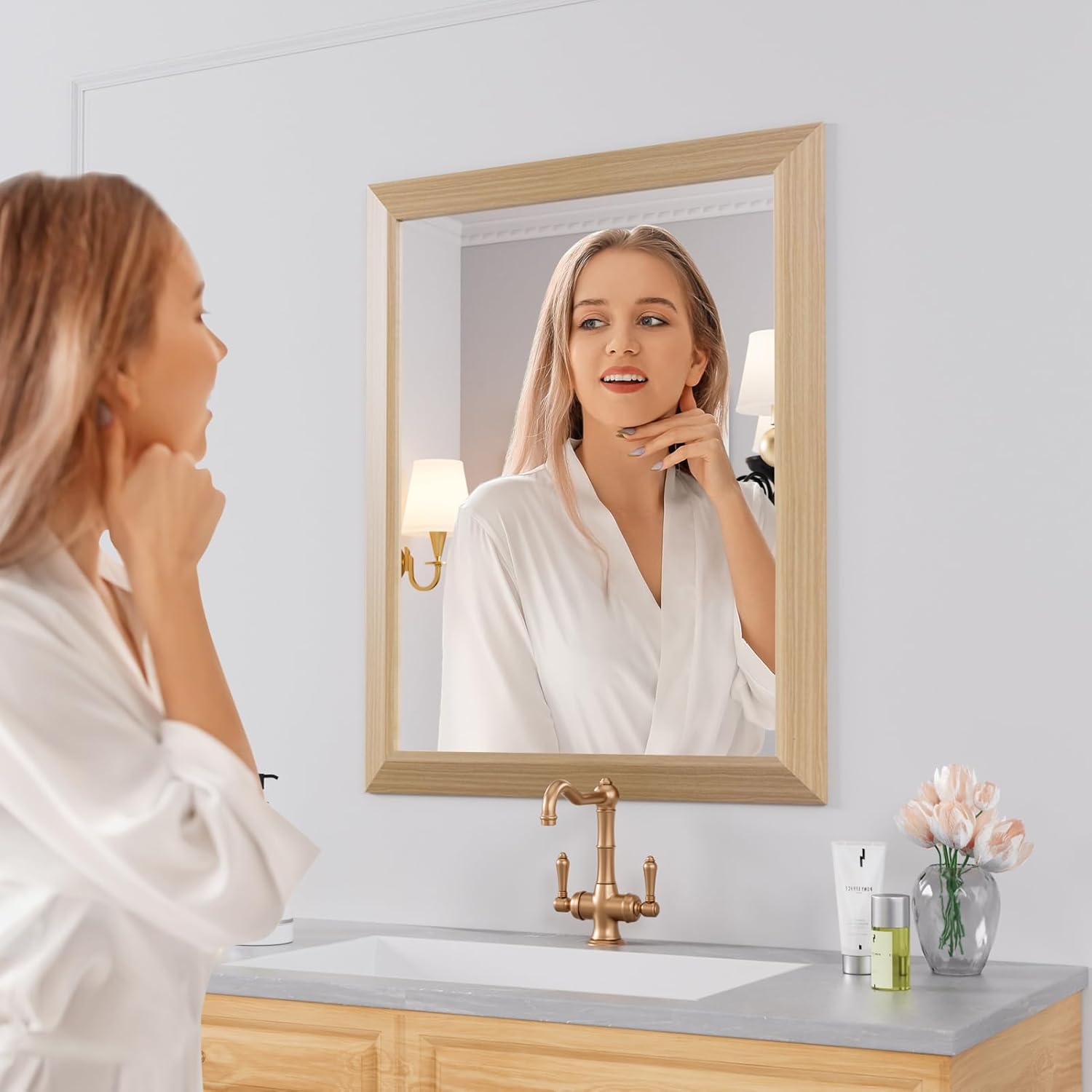 Amorho Bathroom Mirror, 24x30 Inch Wall Mirror, Oak Wood Grain Metal Framed, Anti-Rust, Hang Horizontally/Vertically, Suitable for Bedroom, Farmhouse, Bathroom, Decorative