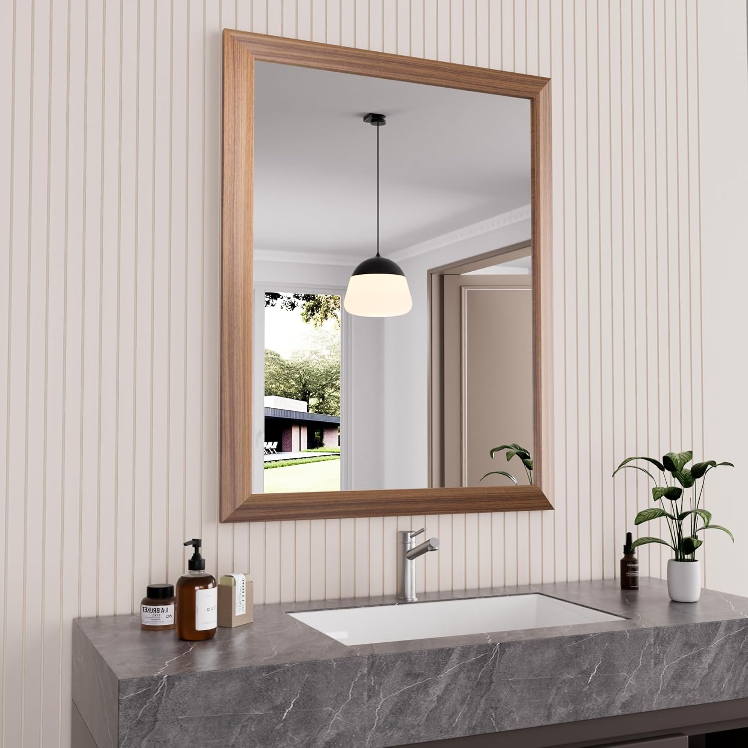 Amorho Bathroom Mirror, 28 X36 Inch Wall Mirror, Walnut Wood Grain Metal Framed, Anti-Rust, Hang Horizontally/Vertically, Suitable for Bedroom, Farmhouse, Bathroom, Decorative