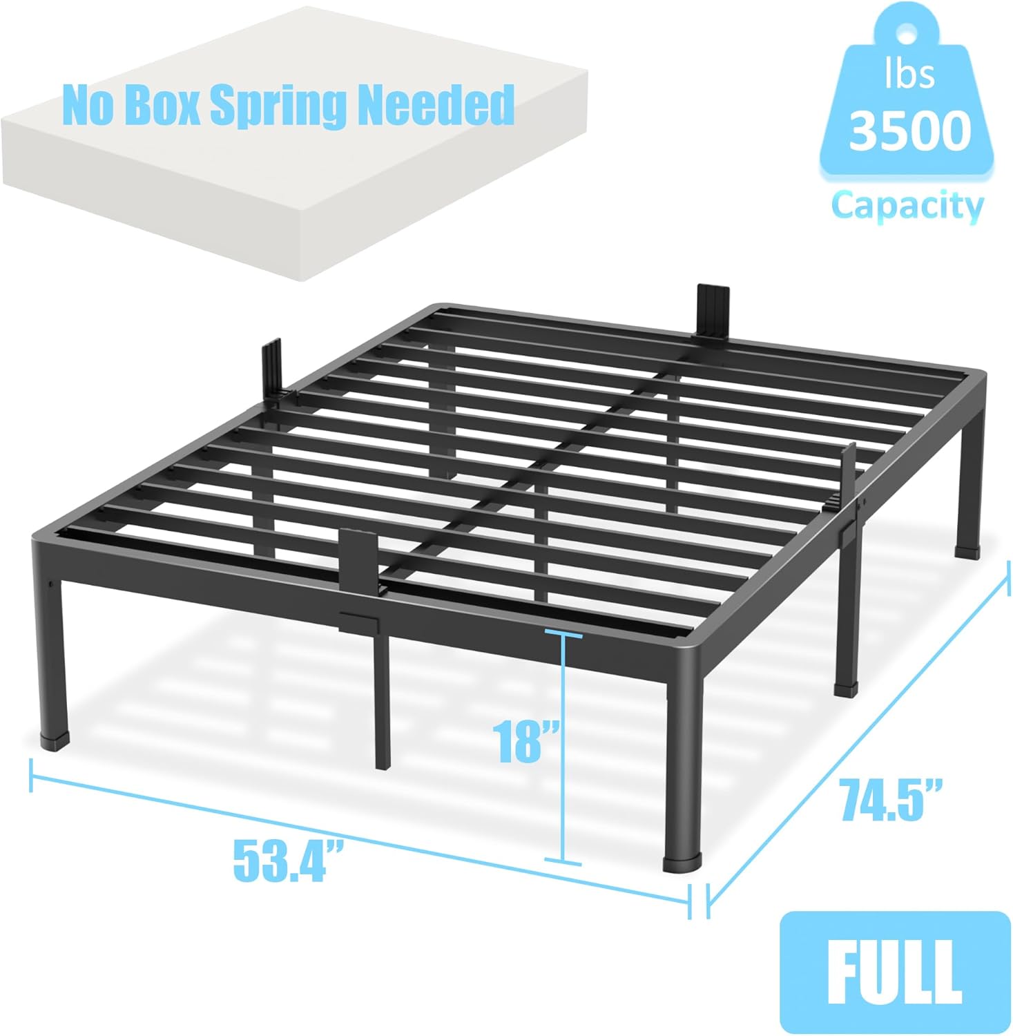 - Heavy Duty Bed Frame:The bed frame full size is made of heavy duty steel strong enough to withstand 3500 lbs the full bed frame is no squeak and comes with anti-scratch gaskets to protect your floor.
