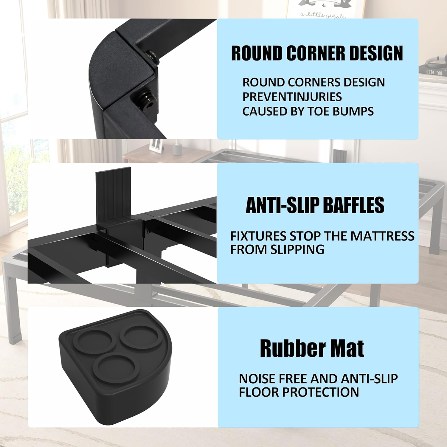 - Special Feature : 16.4 inch Under-bed Storage Space, Anti-slip and Noise-free Rubber Pads, No Box Spring Needed, Round Corner Legs, Squeak Resistant 16.4 inch Under-bed Storage Space, Anti-slip and Noise-free Rubber Pads, No Box Spring Needed, Round Corner Legs, Squeak Resistant