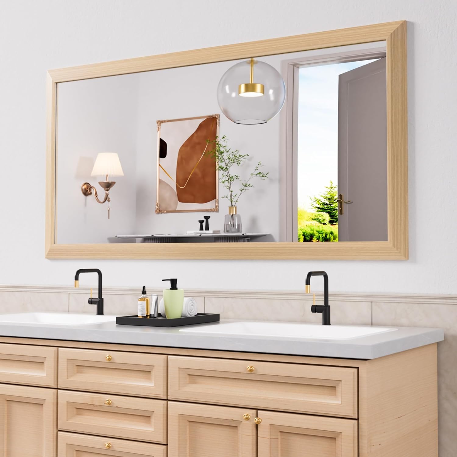 Amorho 60 X30 Inch Bathroom Mirror for Wall, Oak Wood Grain Metal Framed Mirror, Anti-Rust, Hang Horizontally/Vertically, Suitable for Bedroom, Farmhouse, Bathroom, Decorative