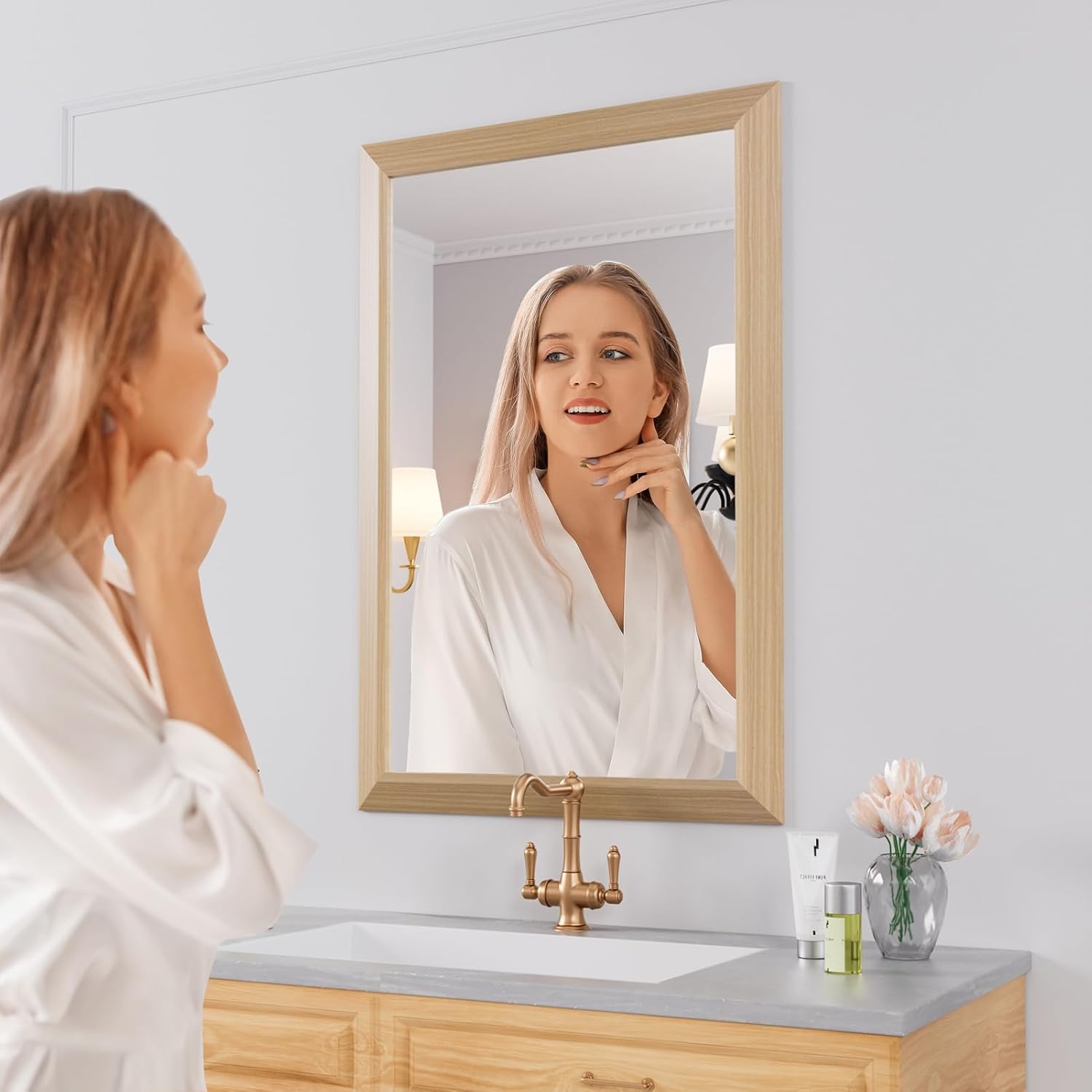 Amorho 24x36 Inch Bathroom Mirror for Wall, Oak Wood Grain Metal Framed Mirror, Anti-Rust, Hang Horizontally/Vertically, Suitable for Bedroom, Farmhouse, Bathroom, Decorative