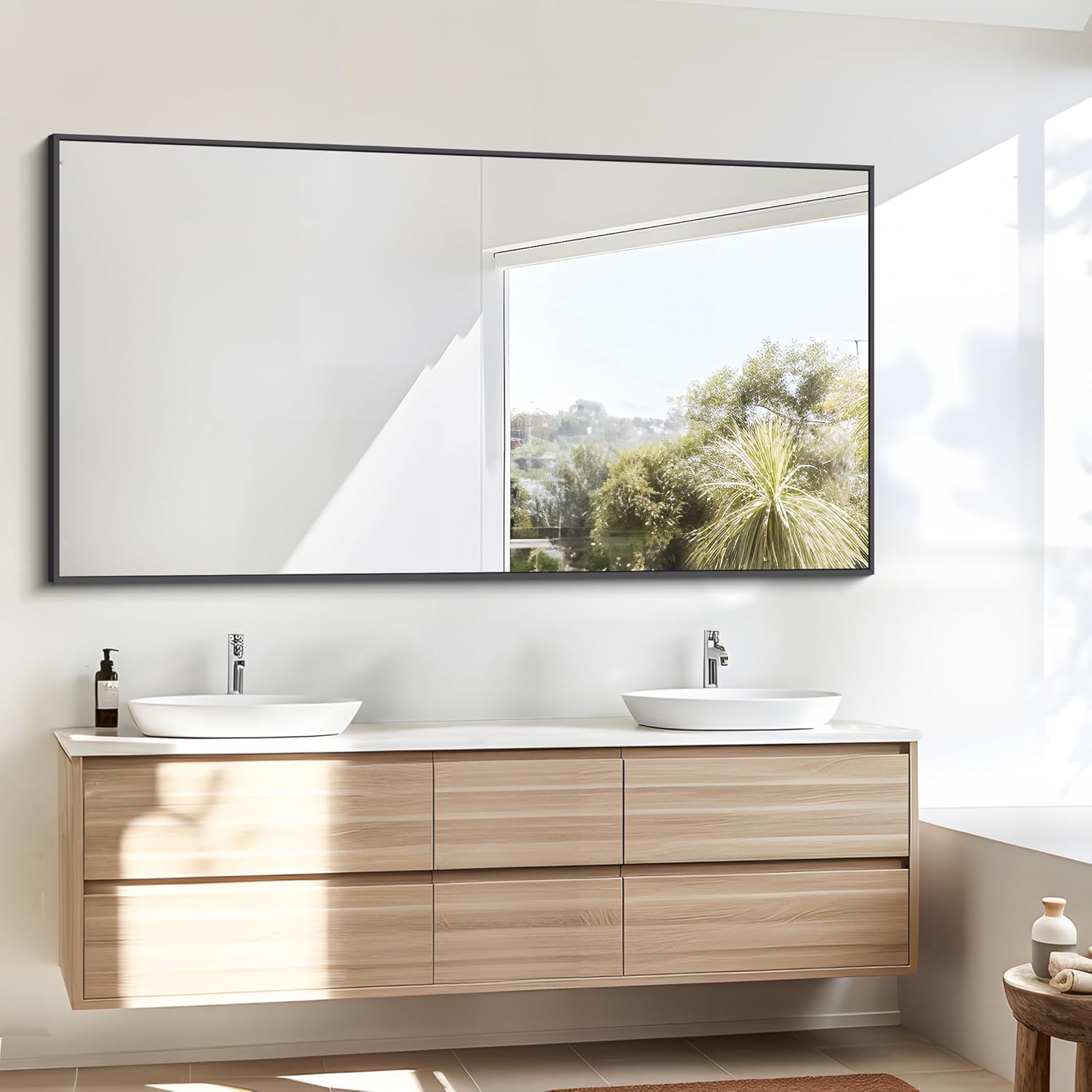 - HIGH SAFETY : The package for this wall mounted bathroom mirror is well,Sturdy and reliable, equipped with explosion-proof film and explosion-proof glass, even if impacted by external forces, black frame mirror glass will not break and splash, ensuring higher safety and protection.