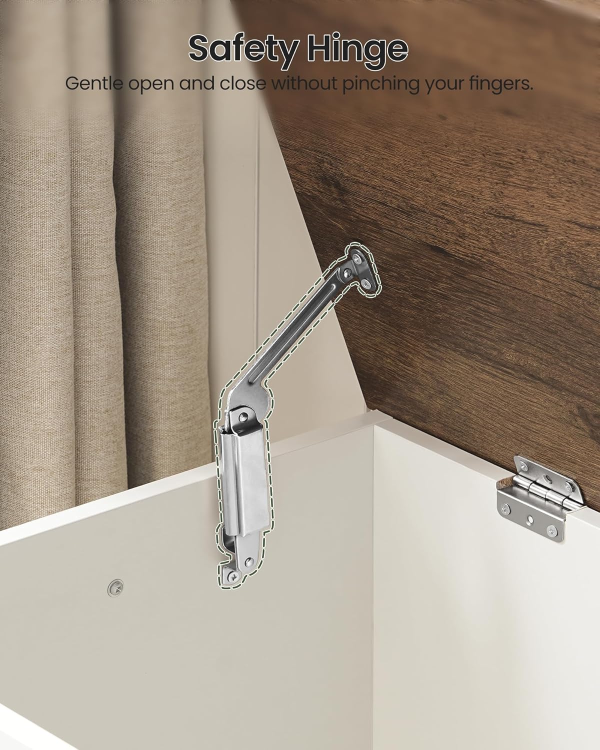 - Sturdy Support and Safety Hinge: Crafted with premium boards and metal fittings, this storage trunk boasts a 220 lb on its top for durability. The safety hinge and U-shaped cutout prevent finger pinching, adding extra protection for your daily use