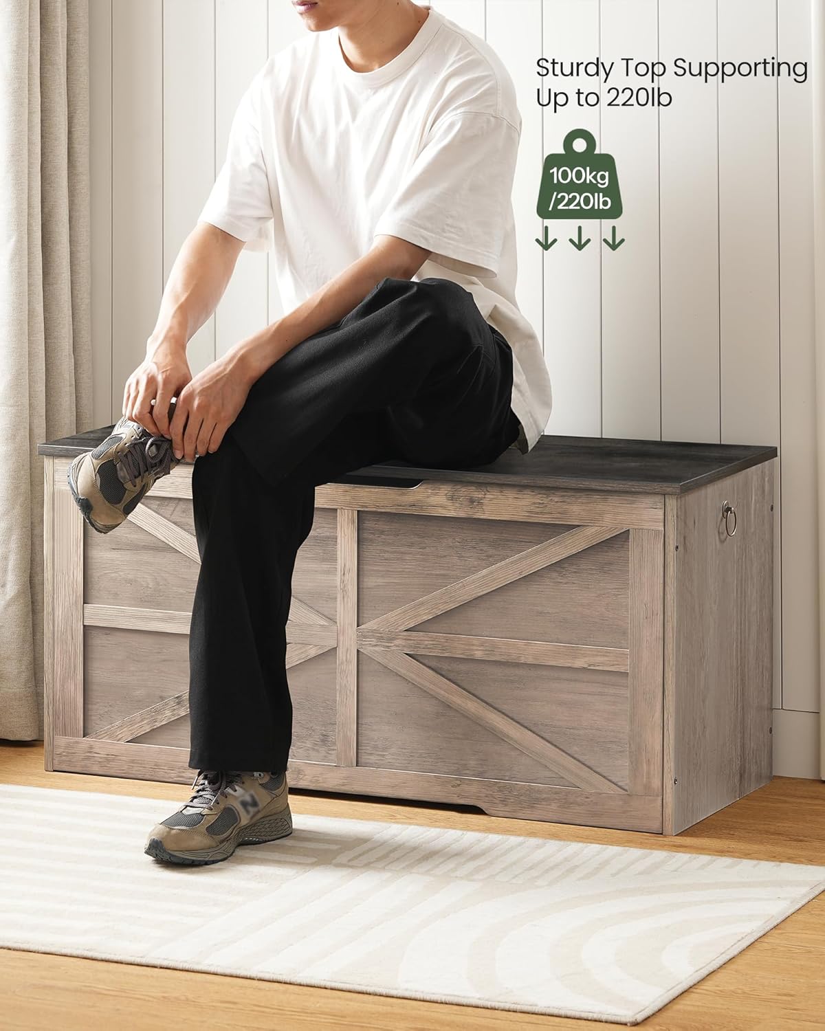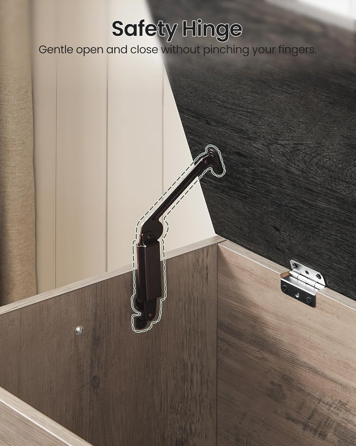 - Sturdy Support and Safety Hinge: Crafted with premium boards and metal fittings, this wooden storage bench boasts a 220 lb on its top for durability. The safety hinge and U-shaped cutout prevent finger pinching, adding extra protection for your daily use