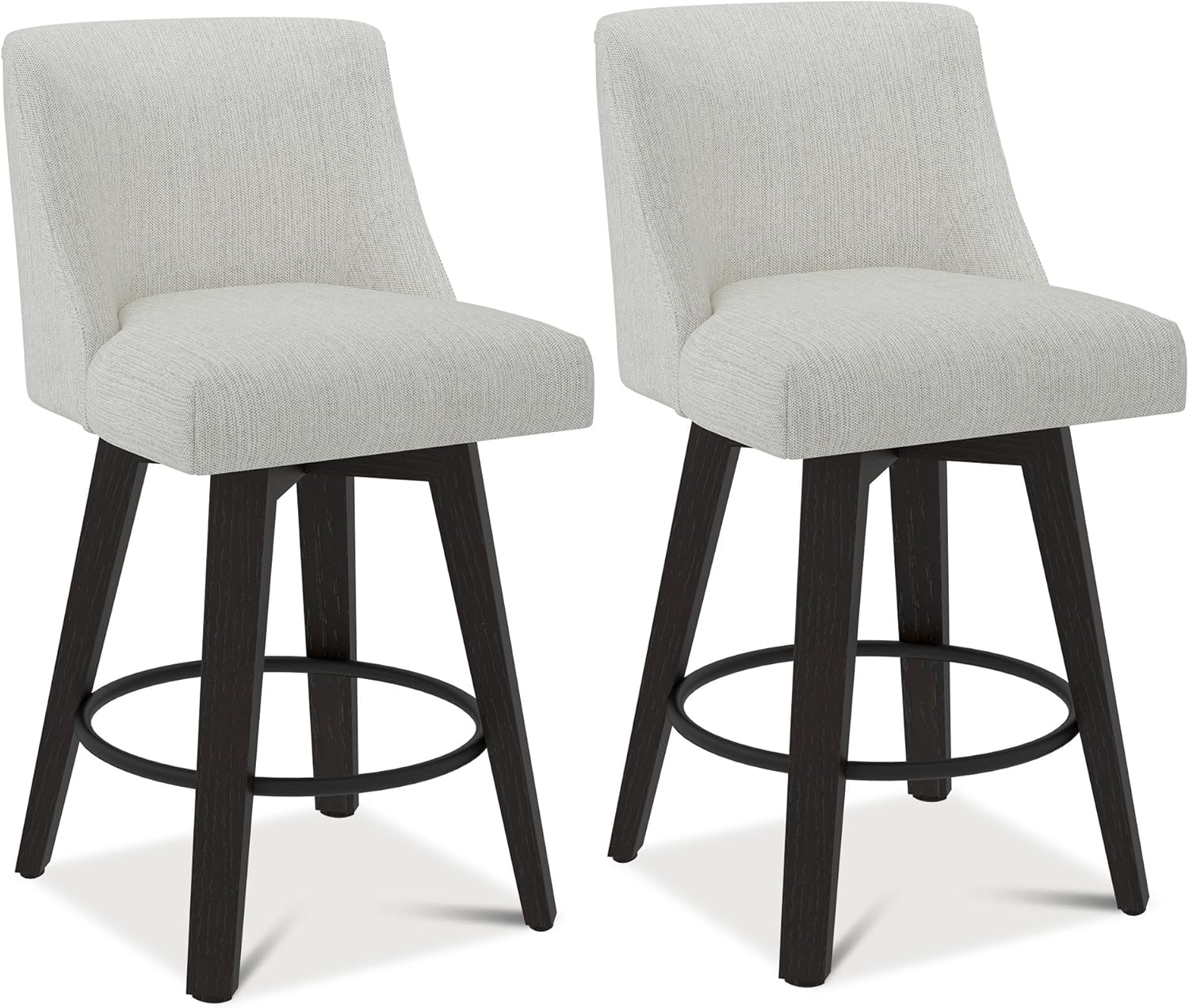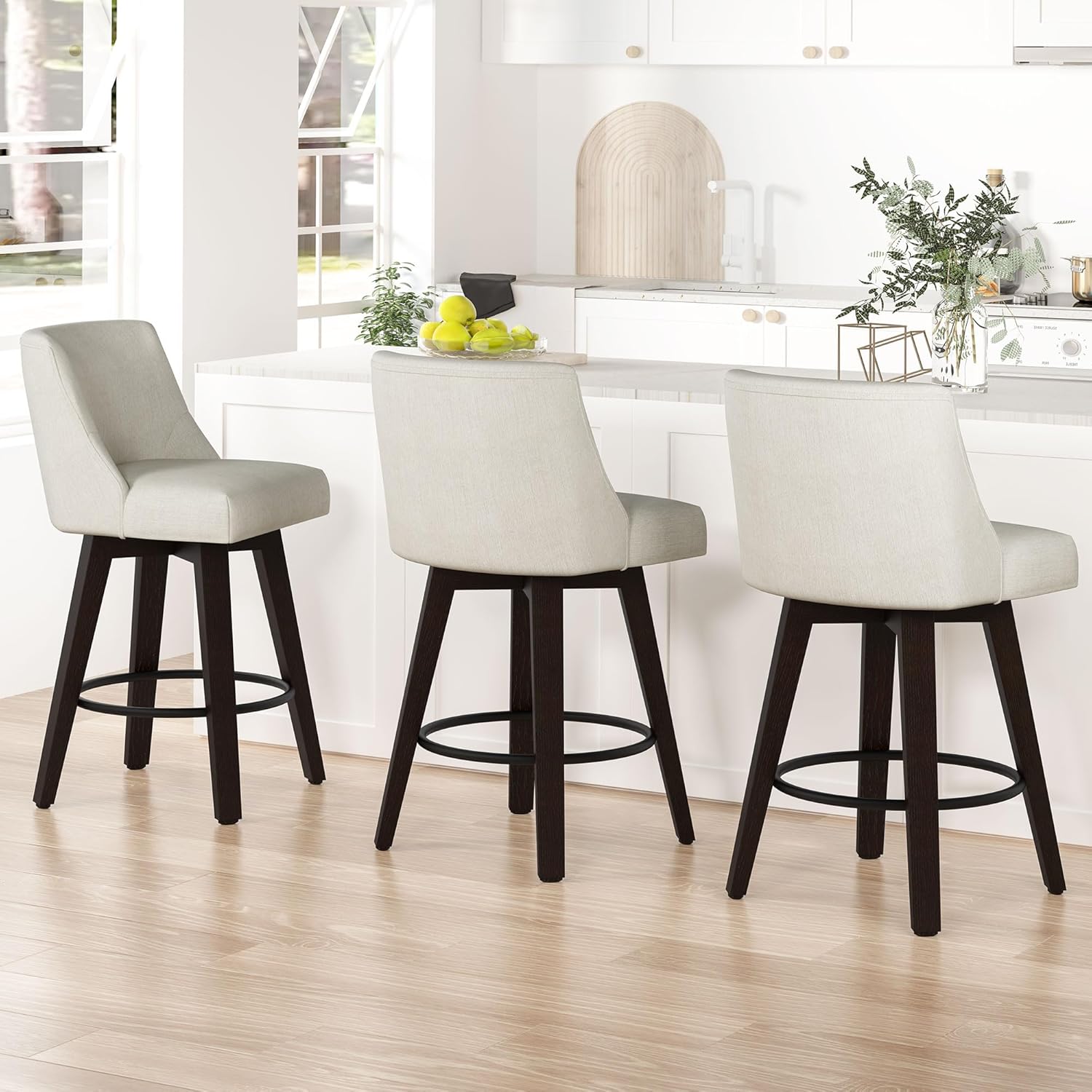 Counter Height Swivel Bar Stools Set of 2, 26" Seat Height Modern Bar Stools with Back and Solid Wood Legs for Kitchen Island, Fabric in Ivory White