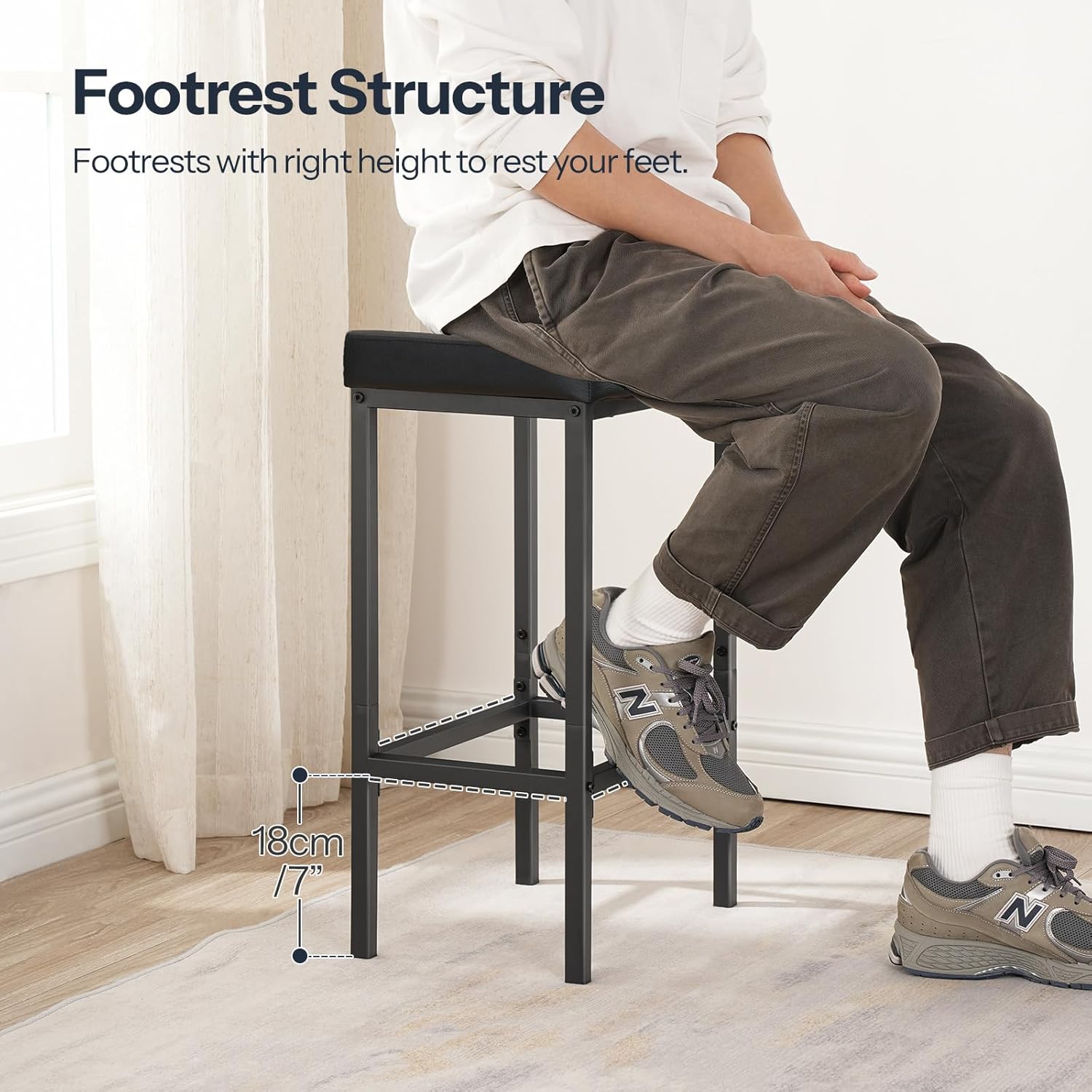 - Fashionable Shape: Each bar stool adopts a modern style and its curved seat is decorated with quality PU leather. The black soft cushion and square tubes complement each other, creating a seamless and low-key luxury