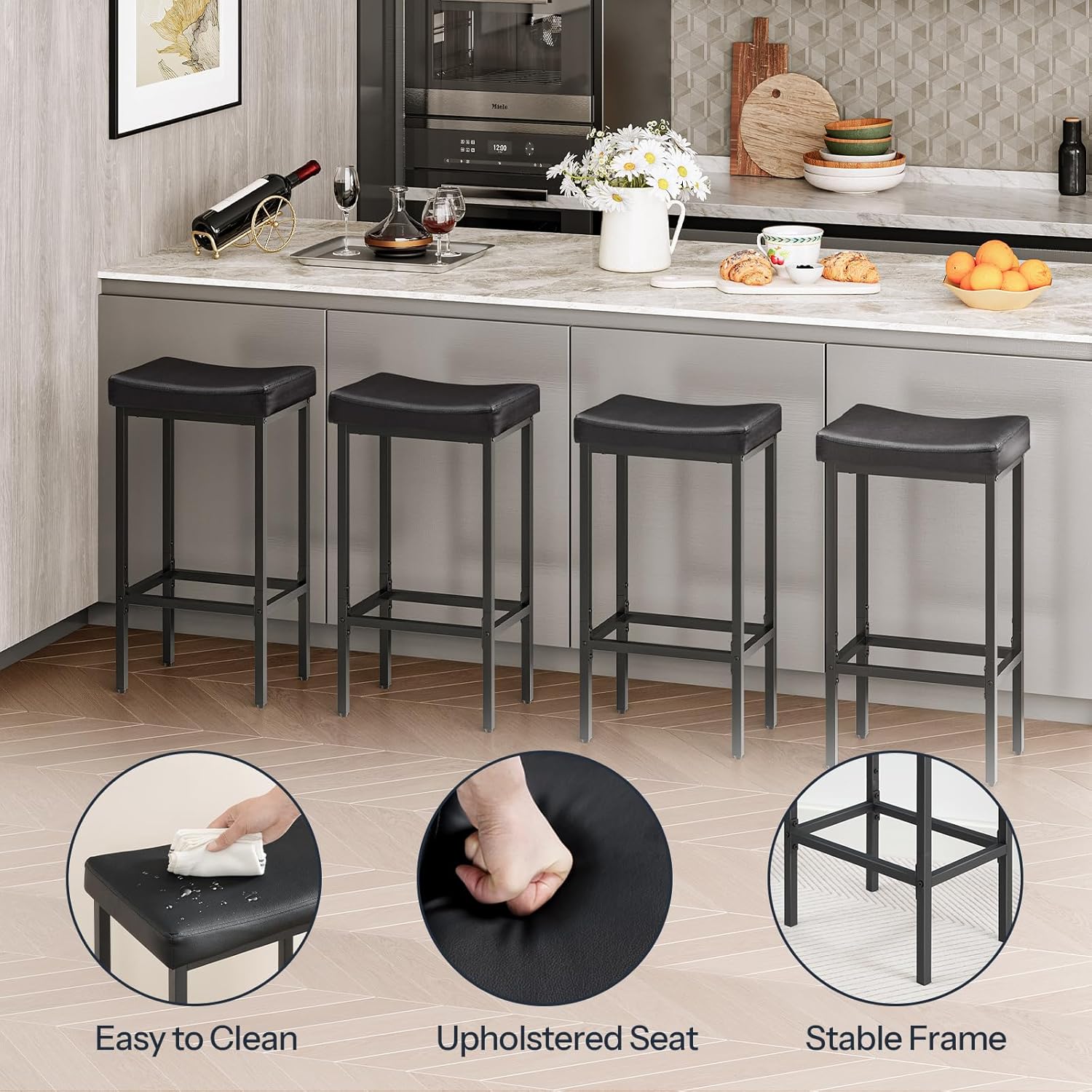 - Safe and Cozy: Each bar stool comes with a soft saddle seat and footrests, having you enjoy a more comfortable and relaxed sitting experience. The ergonomic sponge pad can distribute the weight evenly, thus reducing the pressure on your body