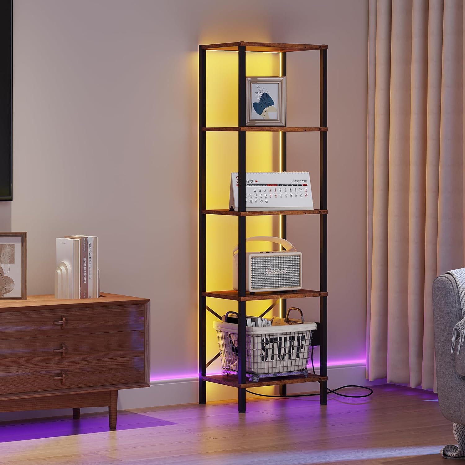 5-Tier Bookshelf, Tall Narrow Bookcase with LED Lights, Book Shelf with Steel Frame, Office Furniture, Display Storage Shelf for Living Room, Bedroom, Study, Balcony, Rustic Brown