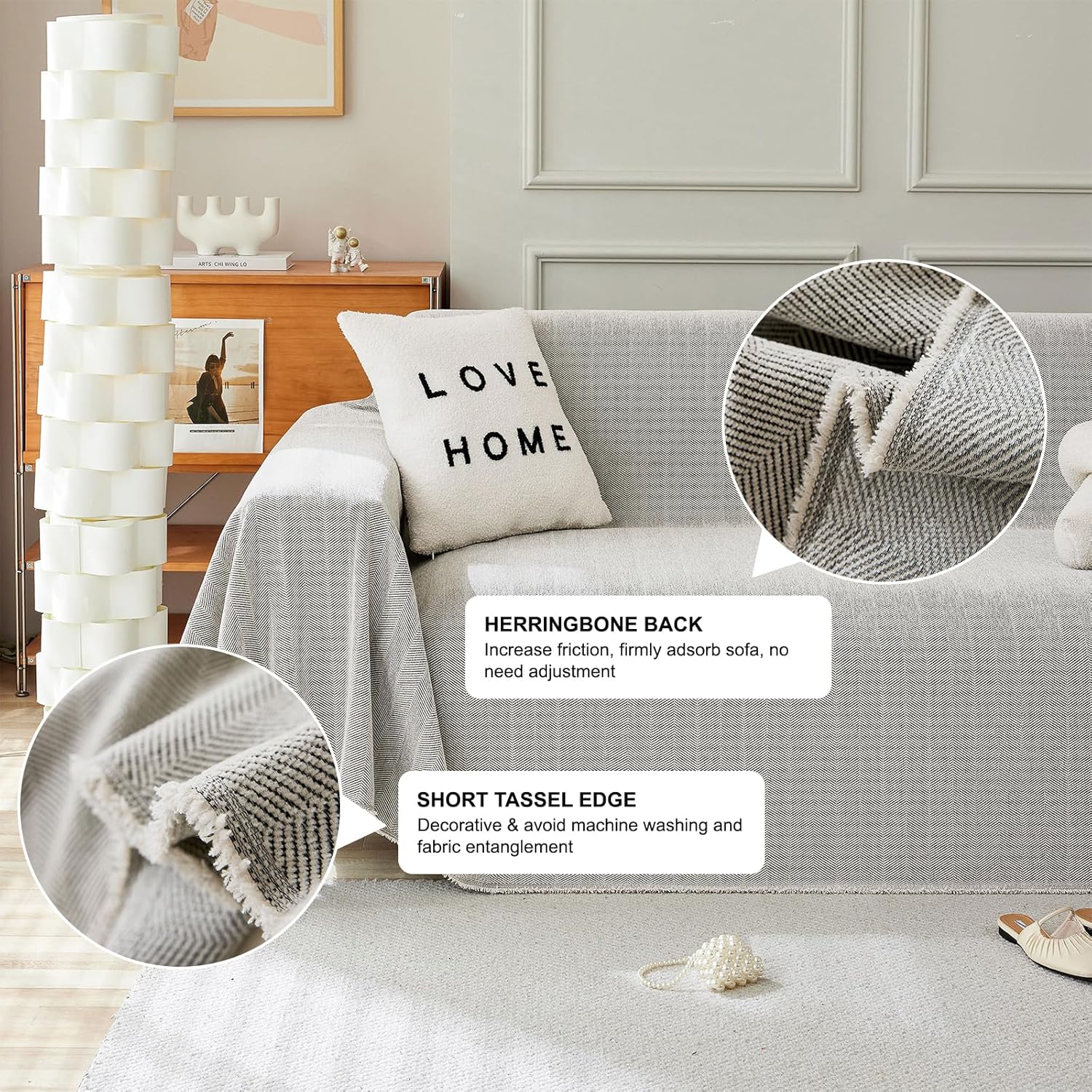 STACYPIK Silver Gray Sofa Cover for Dogs, Herringbone Couch Cover for Sectional, Pets Protector for 3 Cushion Couch, Washable Anti-Slip Loveseat Cushion Cover with Tassel, Multi-Use Blankets-71X134IN
