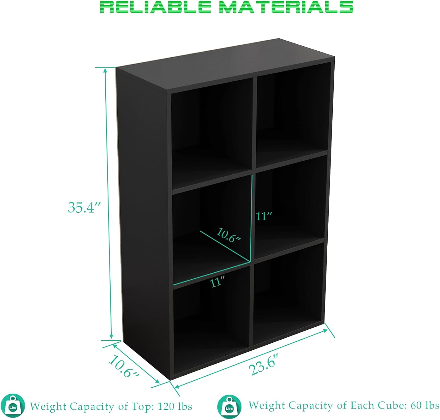 6-Cube Storage Shelf Bookcase - Wooden 3-Tier Floor Standing Open Bookshelf for Home and Office, Display Cabinet, Black