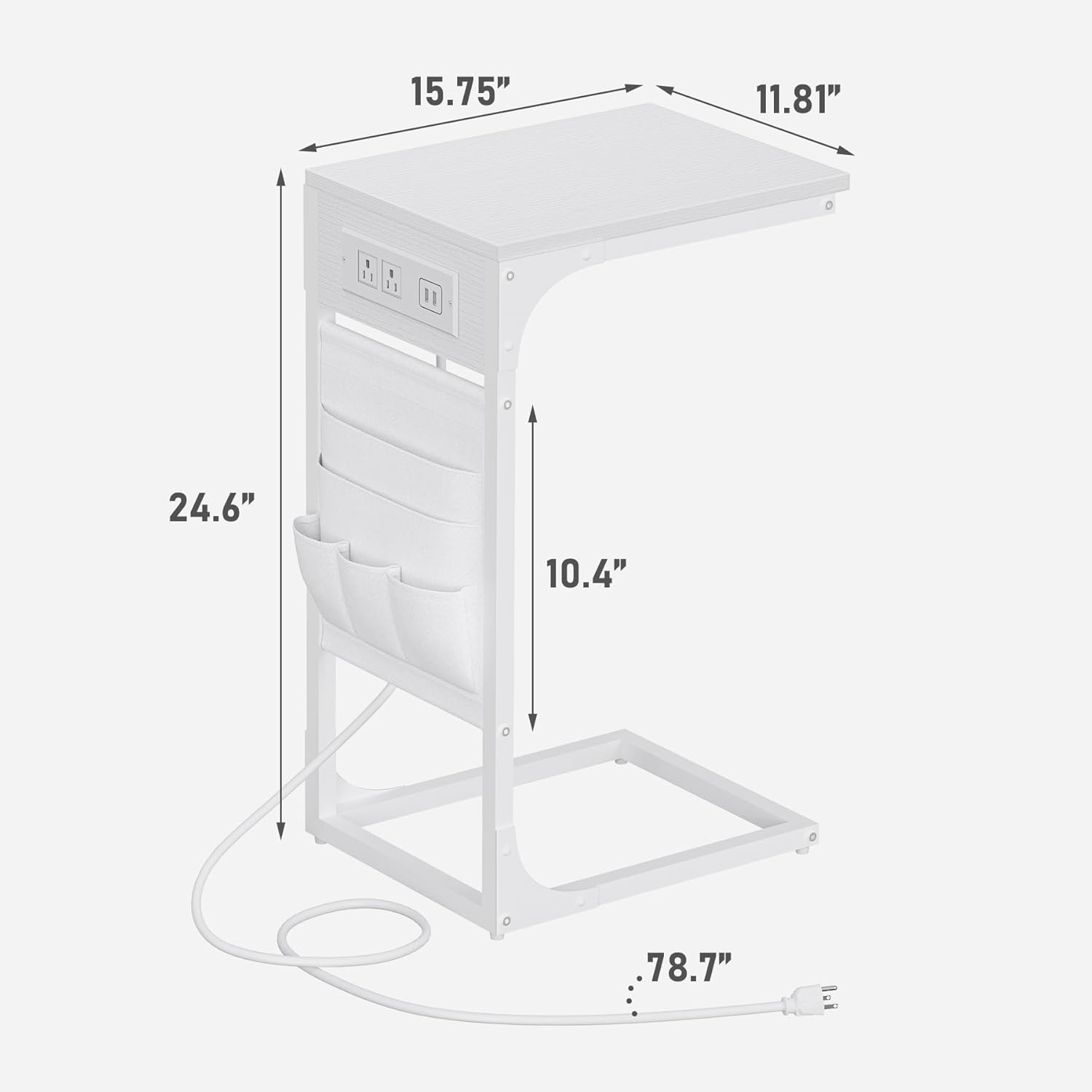 TUTOTAK C Shaped End Table with Charging Station, Side Table for Sofa, Couch Table with Storage Bag, TV Tray Table with 2 USB Ports and Outlets for Living Room, Bedroom, White TB01BW024