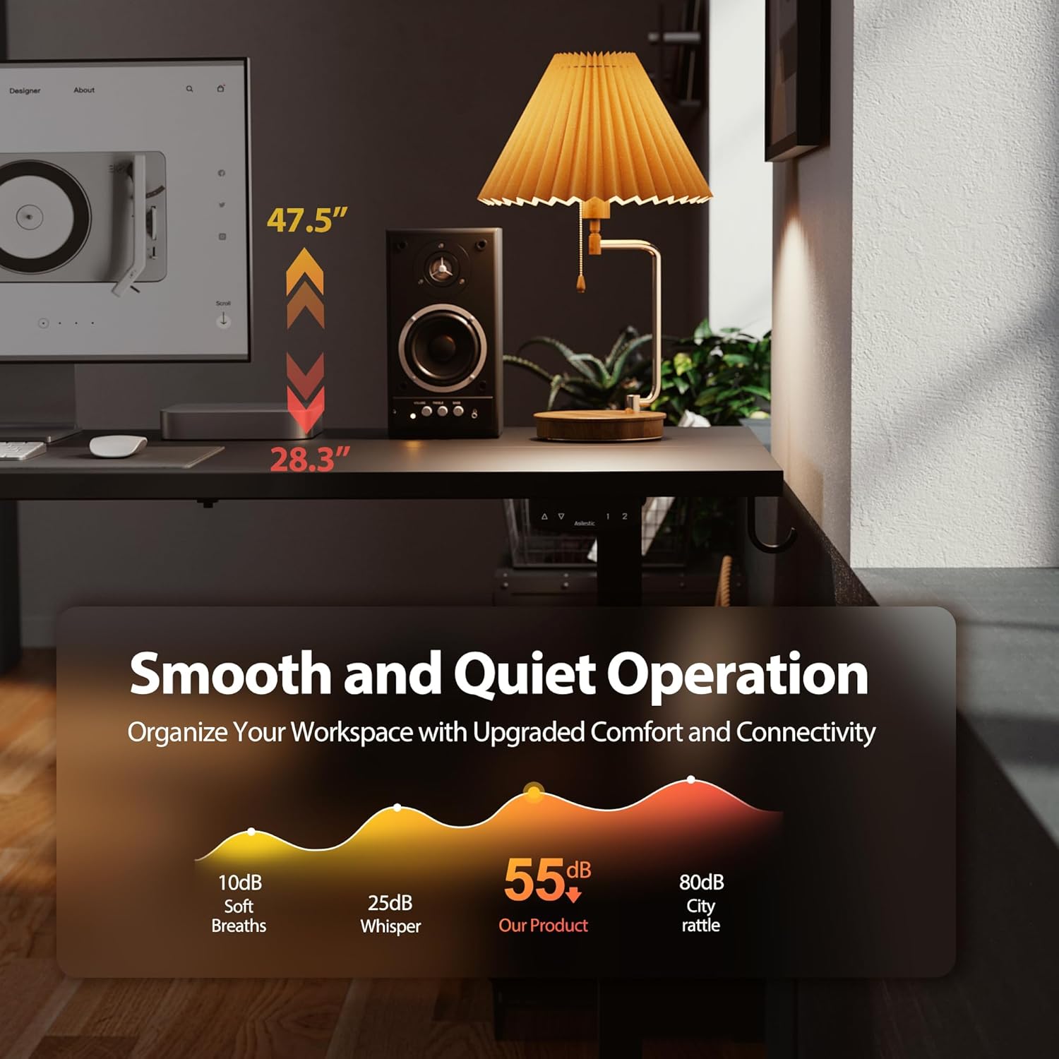 - 【Agile and Stable Lift System】 Equipped with an intelligent electric lifting system, this desk ensures smooth and swift adjustments. The sturdy steel frame supports up to 154 lbs and features a motor tested over 50,000 times for reliable long-term use.