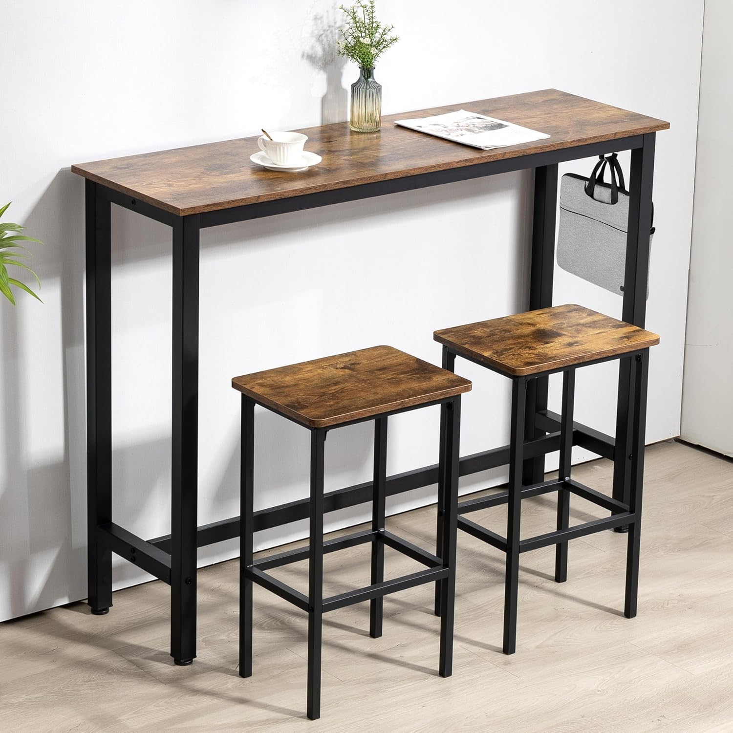 Finnhomy 52.7" Industrial Bar Table Set with 2 Stools - Counter Height Dining & Pub Table for Small Spaces, Kitchen, Apartment, Breakfast Nook - Metal & Wood, Space-Saving Furniture - Rustic Brown