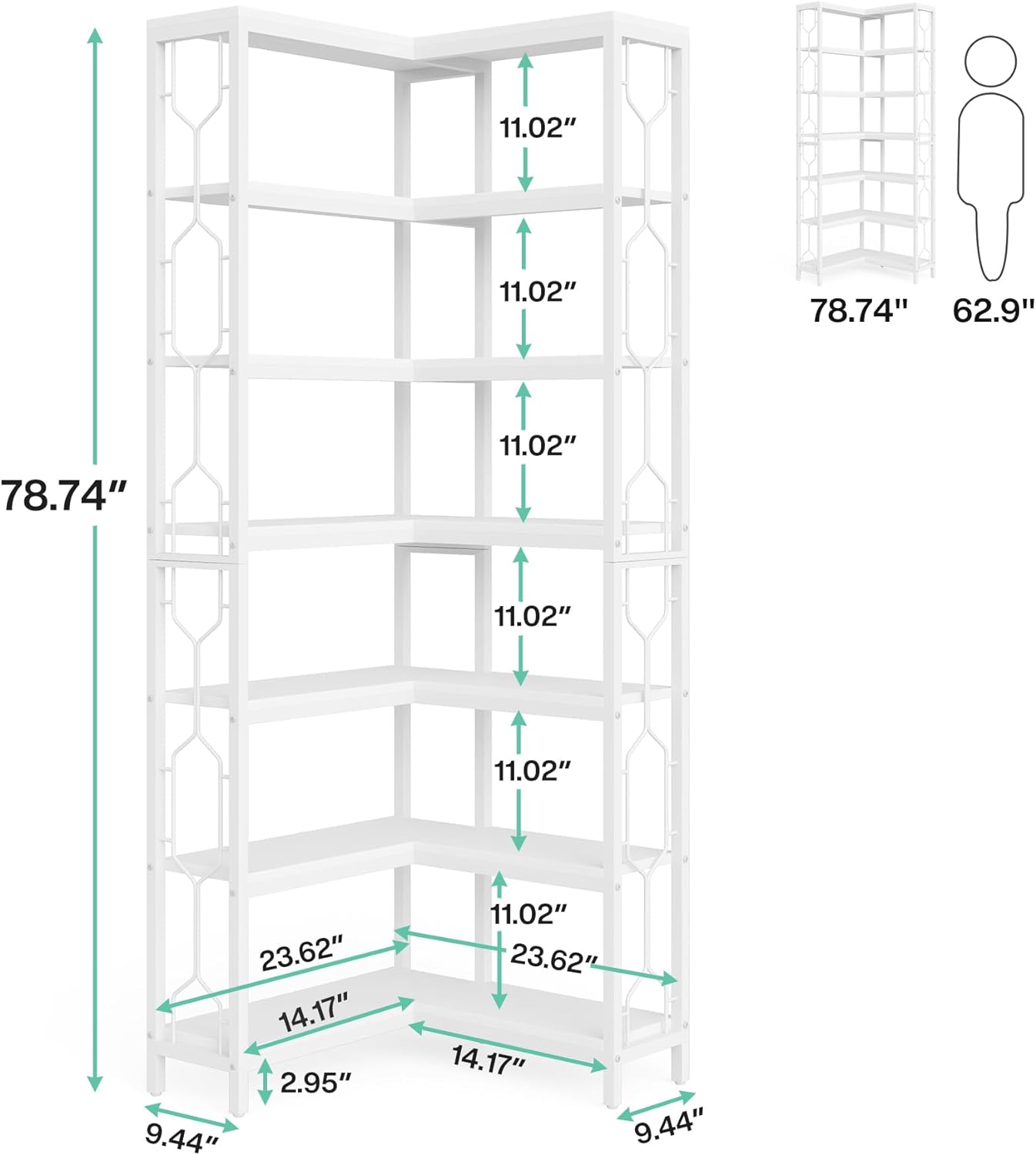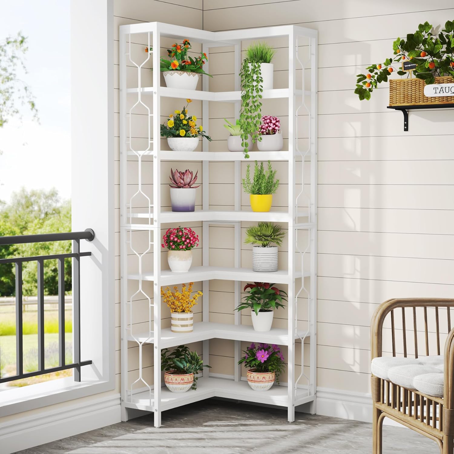 Tribesigns Corner Shelf, 7-Tier Industrial Corner Bookshelf, Wood and Metal Corner Etagere Bookcase, Freestanding Display Shelf for Living Room, Kitchen, Home Office, White