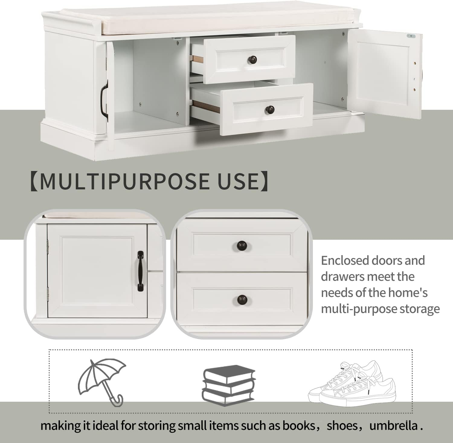 42″ Storage Bench with 2 Drawers and 2 Cabinets,Multipurpose Entryway Shoe Rack W/Removable Cushion,for Living Room Hallway Porch,White