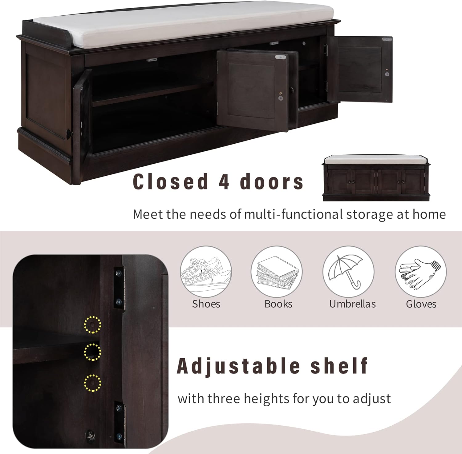 Vintage Hallway Storage Bench with 4 Doors and Adjustable Shelves,Entryway Shoe Rack W/Removable Cushion,for Living Room Bedroom Porch,Espresso,42″