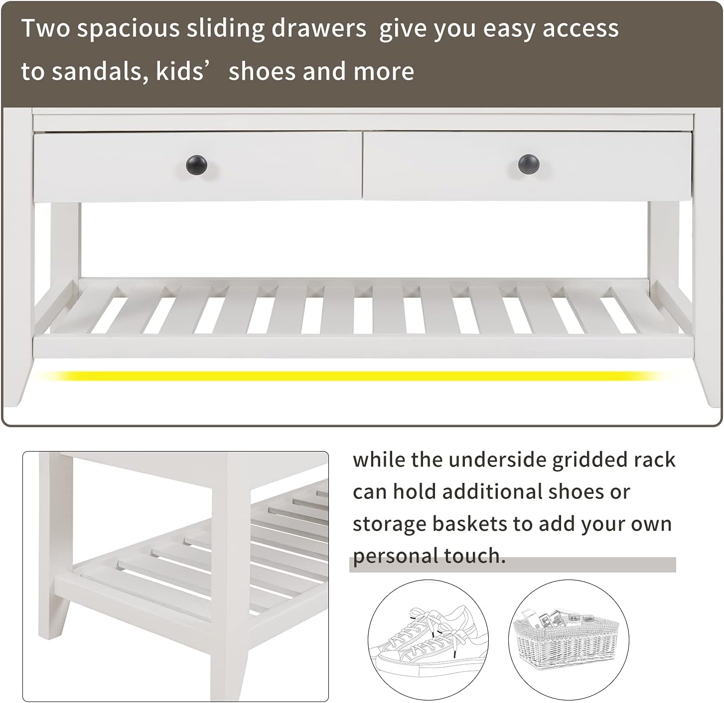- 【Storage Solution】Ideal for family use,this classic bench functions as the perfect inconspicuous storage option to tastefully store your personal belongings rather than leaving them out in the open and accumulating clutter. Two spacious sliding drawers sit directly underneath the upper bench seating area giving you easy access to sandals, kids'shoes and more while the underside gridded rack can hold additional shoes or storage baskets to add your own personal touch.