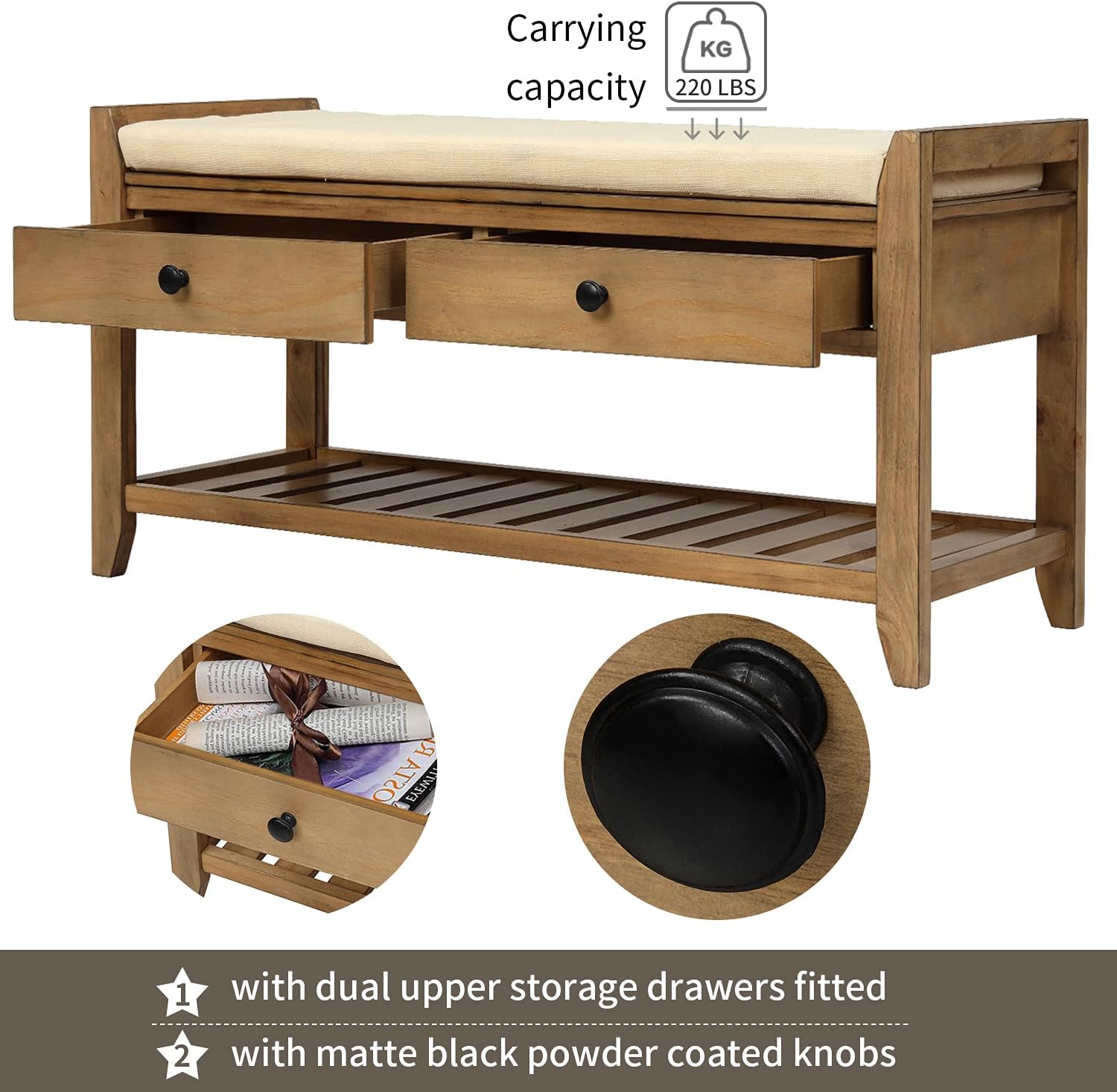 39″ Storage Bench with Cushioned Seat and Drawers,Multipurpose Wooden Entryway Ottoman,Hidden Compartment Organizing Shoe Rack,for Bedroom Hallway Porch,Old Pine