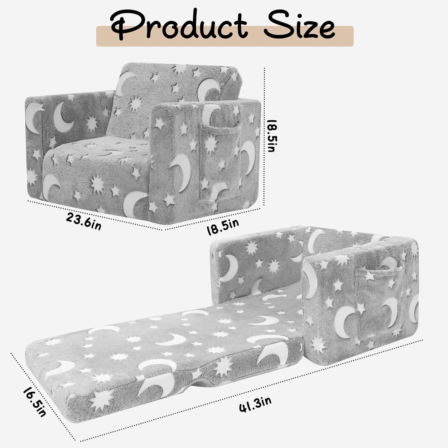 - Flip Open Sofa to Lounger bed: 2-in-1 design, pull out this fold-out chair, baby chair couch converted into a toddler lounger bed . Offering the best feeling for kids when they are sitting or sleeping as the soft glow fabric cover & 30D high quality soft foam.