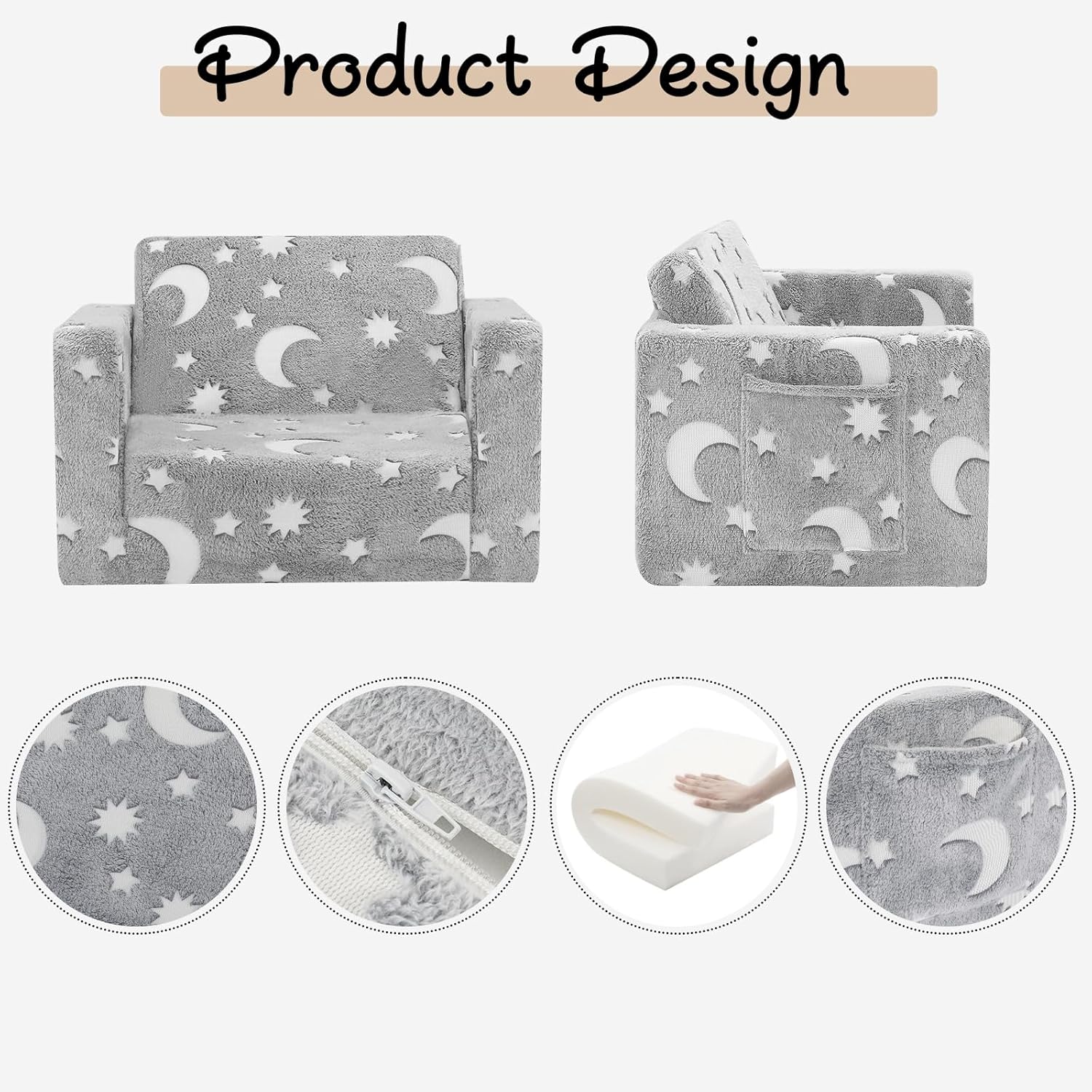 - Couch Safety: Safety is crucial, so make sure the couch is built with rounded edges and safe materials that meet safety standards for children's furniture, high quality foam, Glow fabric, safety zipper.