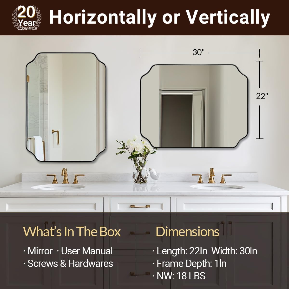 - 【Easy and Secure Installation】: 4 pre-installed D-Rings, along with all necessary hardware and clear installation instructions, ensure a hassle-free setup process. For any missing hardware, simply reach out to us for prompt assistance. Due to its weight, we recommend having 2 people install this heavy bathroom vanity mirror.
