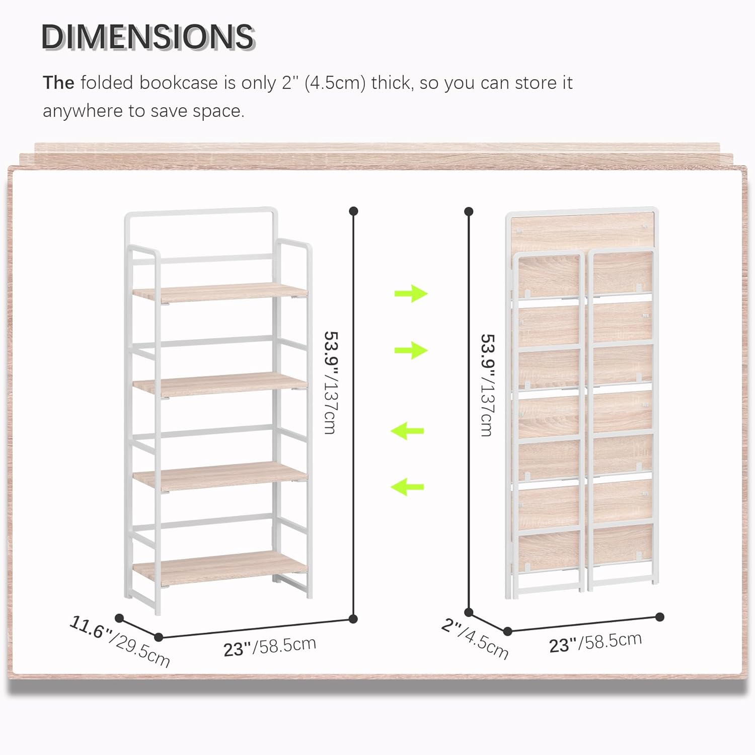 4NM No Assembly Folding Bookshelf, 4-Shelf 54" H Collapsible Foldable Bookcase Storage for Small Spaces, Natural White