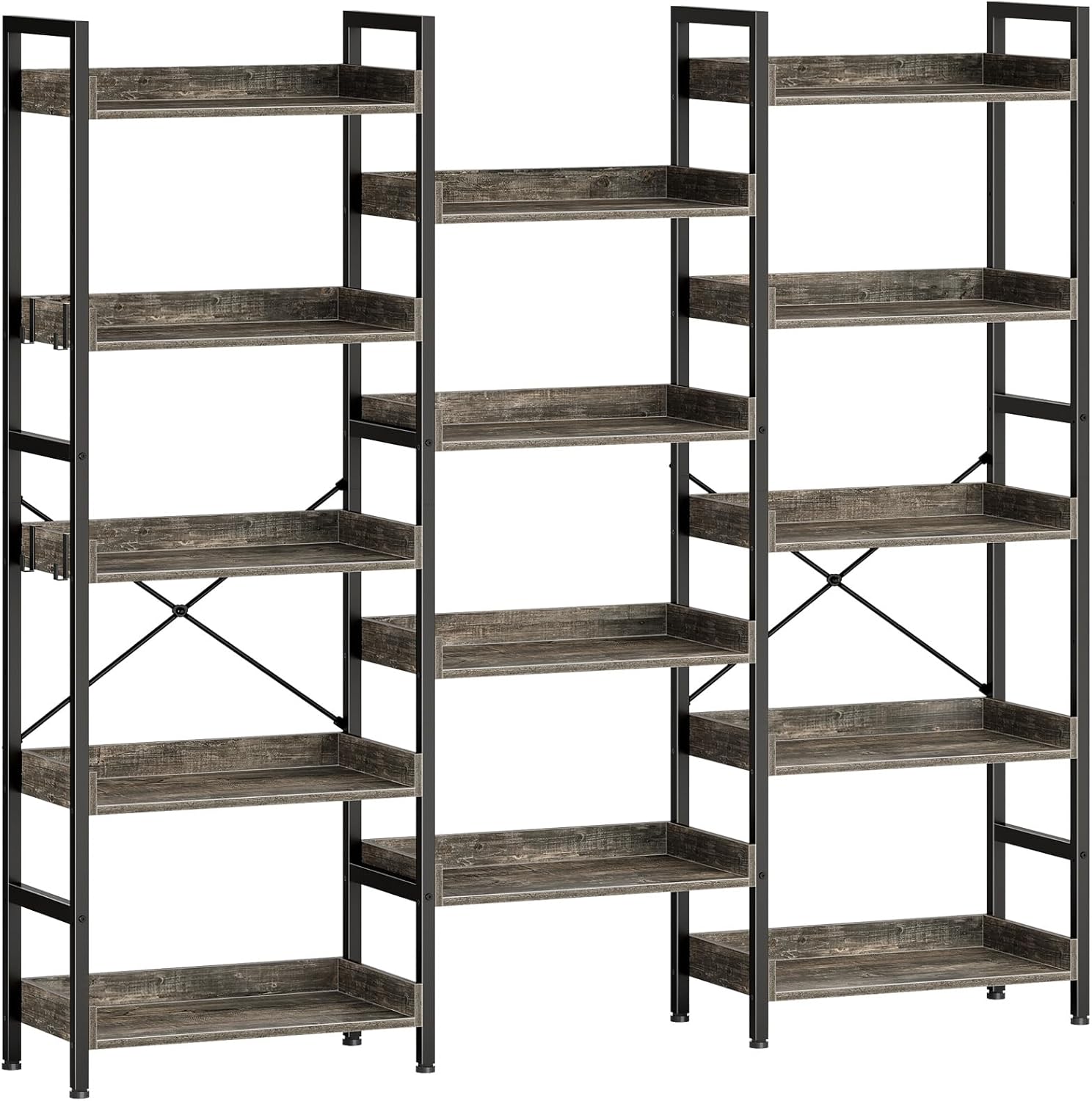Rolanstar Bookshelf 5 Tiers, Triple Bookcase with Open Display Shelves, Industrial Wide Bookshelf with Metal Frame for Living Room, Office, Grey