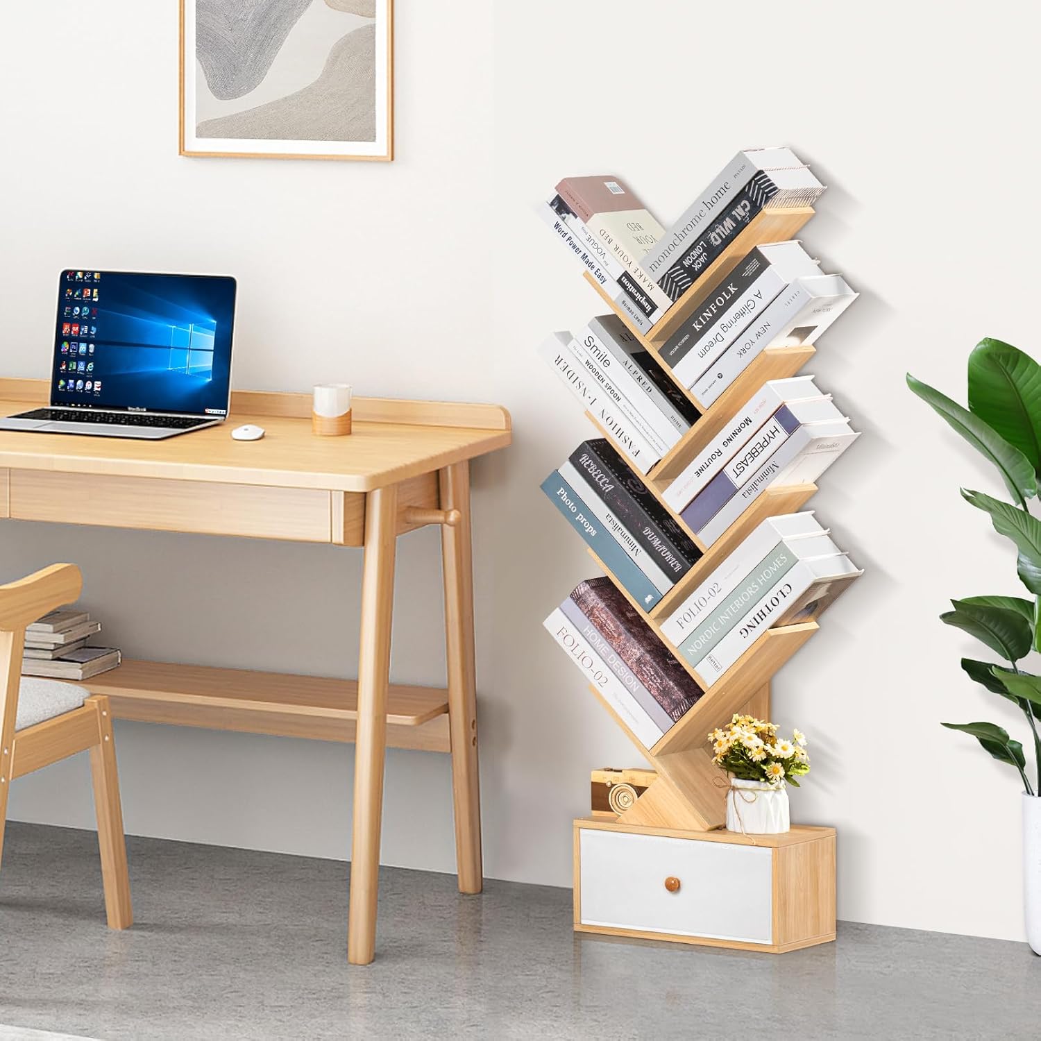 8 Tier Tree Bookshelf with Drawer, Free Standing Wood Bookcase for Narrow Space, Storage Organizer Bookshelves for Books, Book Case for Home Office, Living Room, Bedroom - Natural