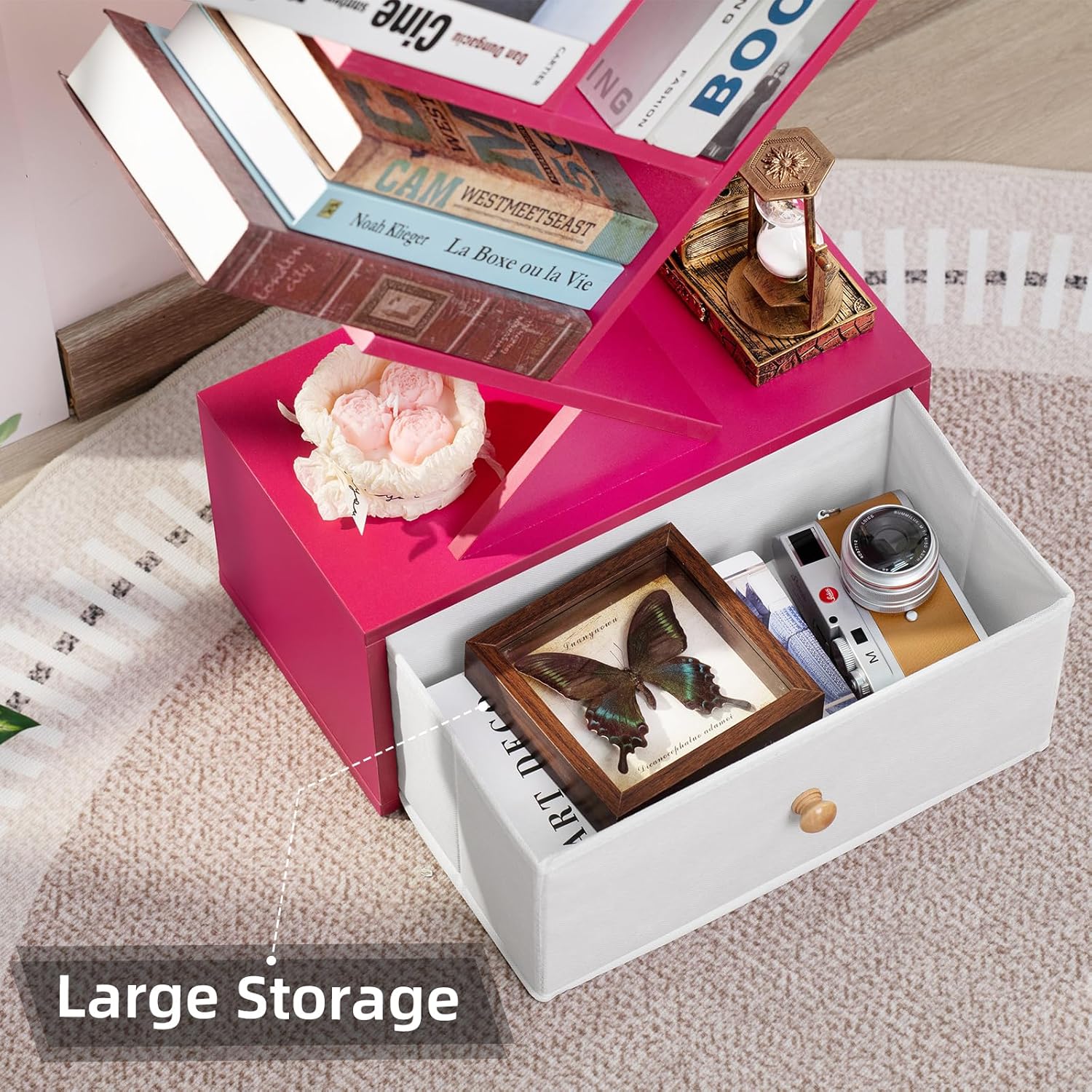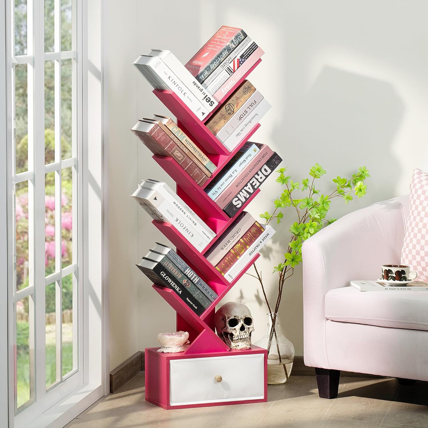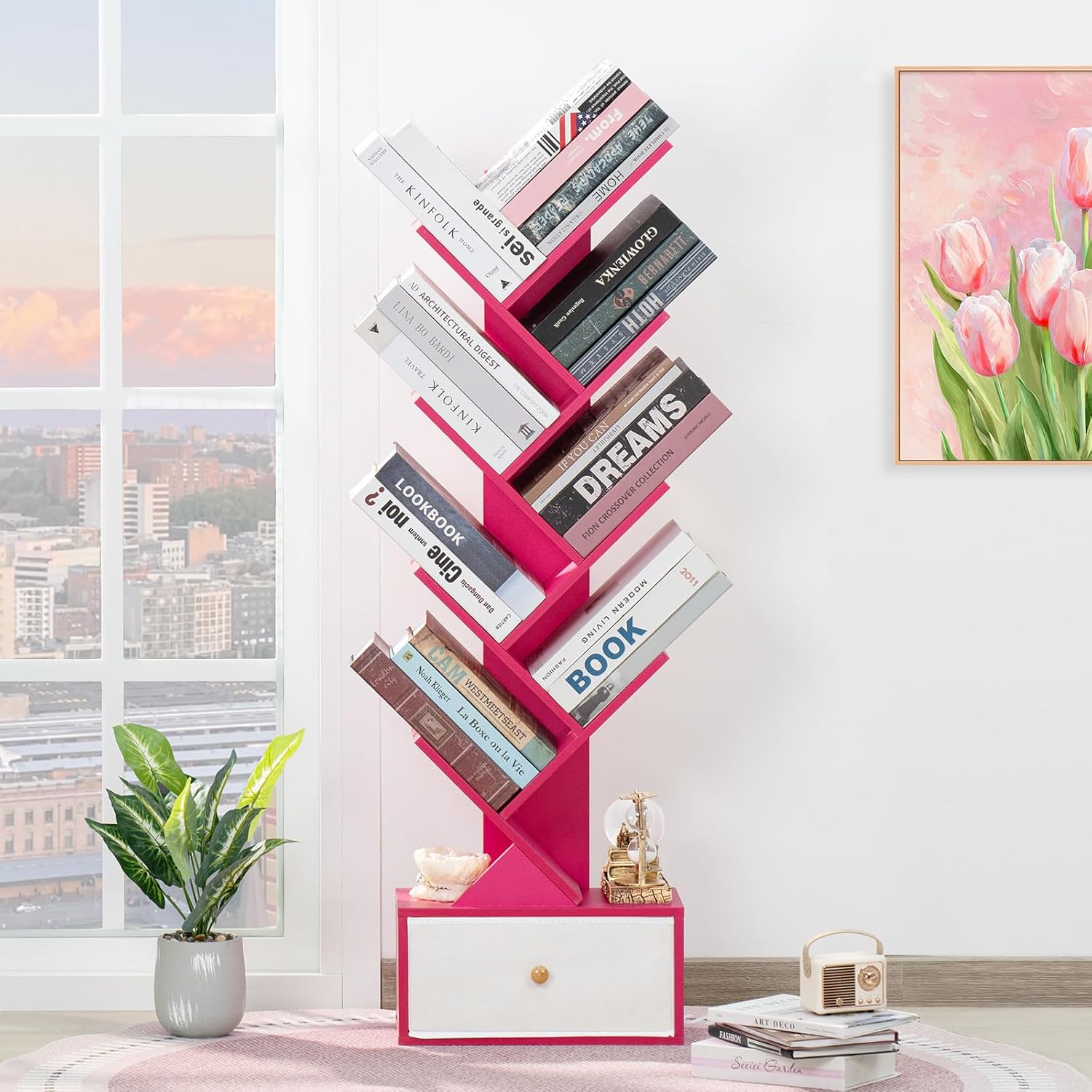 8 Tier Tree Bookshelf with Drawer, Free Standing Wood Bookcase for Narrow Space, Storage Organizer Bookshelves for Books, Book Case for Home Office, Living Room, Bedroom - Pink
