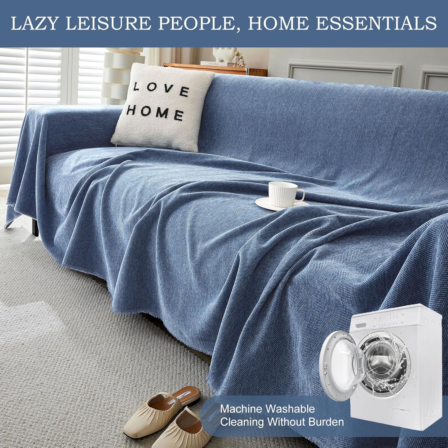 STACYPIK Durable Simple Blue Sofa Cover for Pets Kids Textured Herringbone Chenille Couch Covers for 2 Cushion Couch L Shape Couch Cover Versatile Protector Cover Multi-Use Blanket Washable-91X118IN