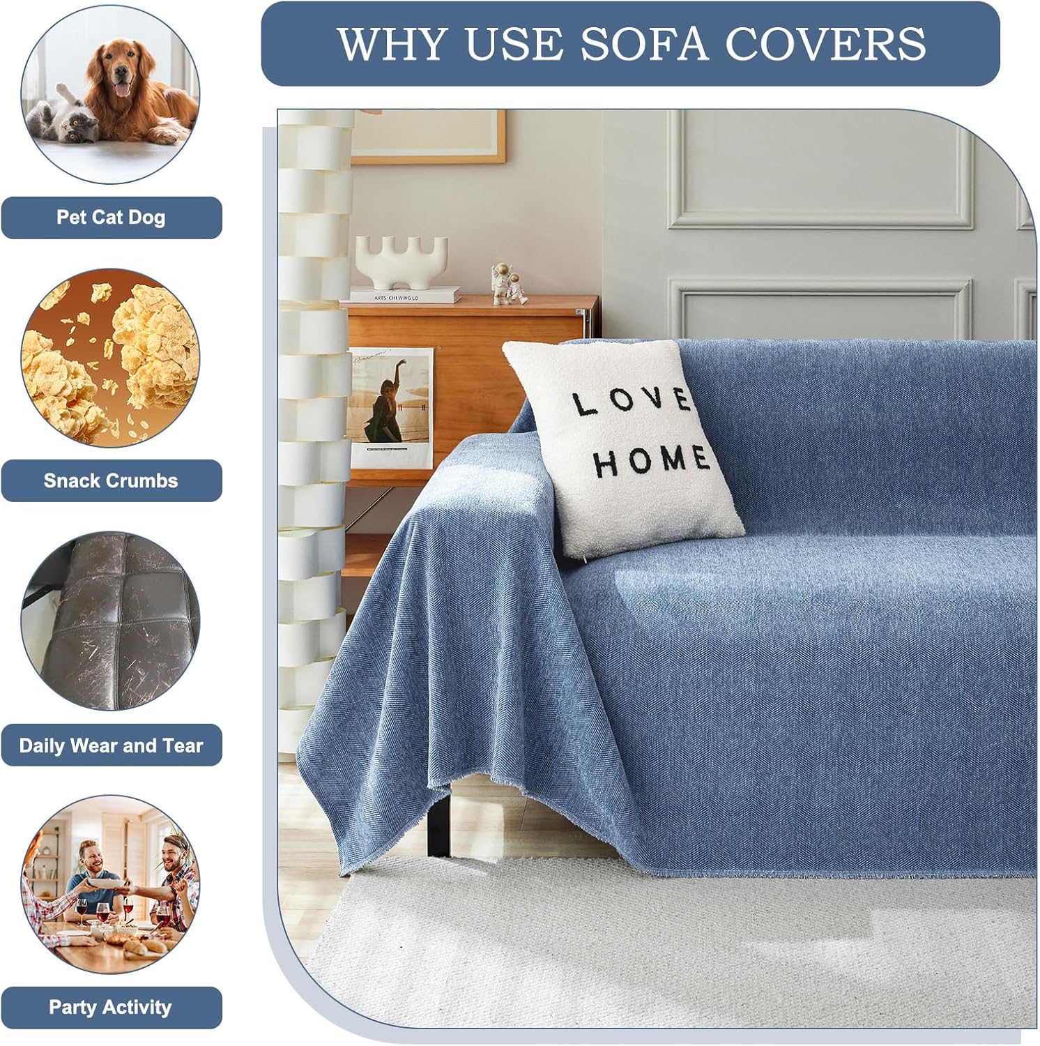 STACYPIK Durable Simple Blue Sofa Cover for Pets Kids Textured Herringbone Chenille Couch Covers for 3 Cushion Couch L Shape Couch Cover Versatile Protector Cover Multi-Use Blanket Washable-91X150IN