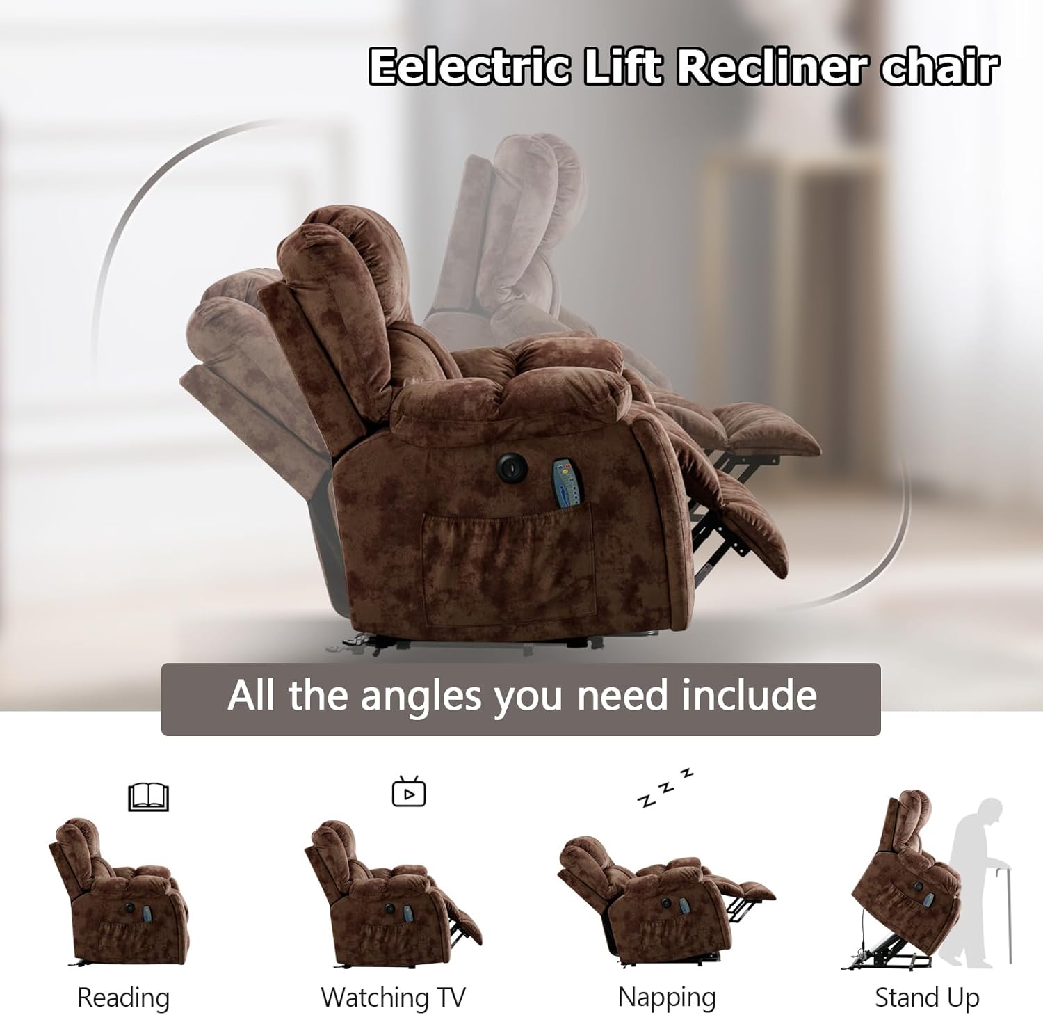 - 8-Point Massage & Lumbar Heating: The electric lift recliners offers an advanced 8-point massage system with 2 different vibration intensities and 5 adjustment modes. Our power lift chair targets key areas of the body including upper back, lower back, thigh and lumbar, providing a soothing and therapeutic experience. Lumbar heating element helps to relax and relieve tension in the lower back and promoting circulation.