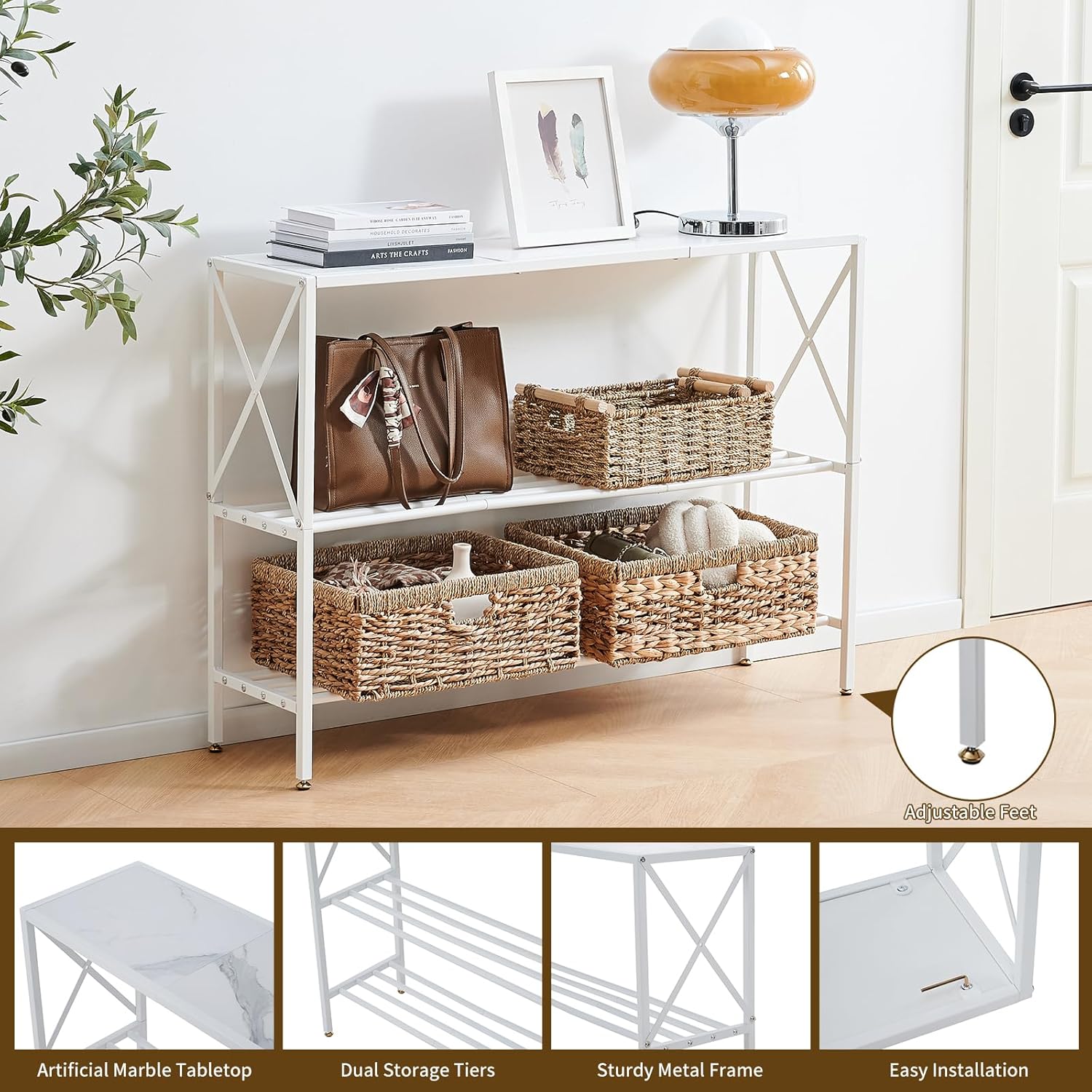 - 【3 TIERS STORAGE】Entryway Table, This console table offers ample storage and display options, with its wide top that can hold books, photo frames, and other items. Console Table, 2 racks for storage baskets, shoes and gift boxes