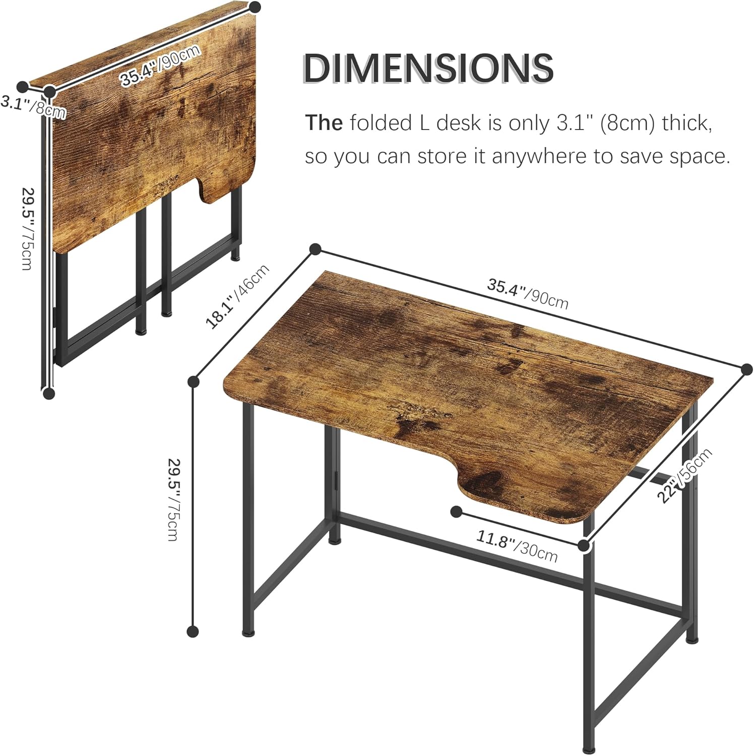 4NM Folding Desk, 35.4 Inch Small Foldable L Desk for Small Spaces, Space Saving Computer Table Writing for Home Office Bedroom, Easy Assembly, Rustic Brown
