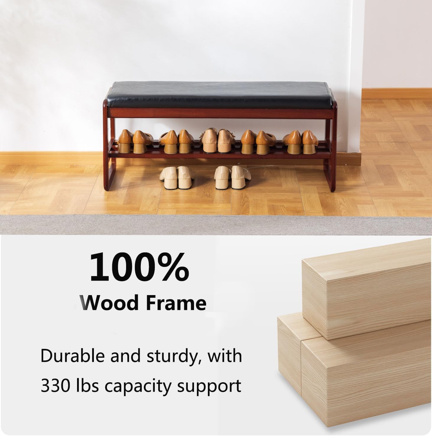 Solid Wood Shoe Bench, 2-Tier Wooden Entryway Bench, Modern Shoe Rack with Faux Leather Cushion for Hallway, Living Room (Black, 39.4'')