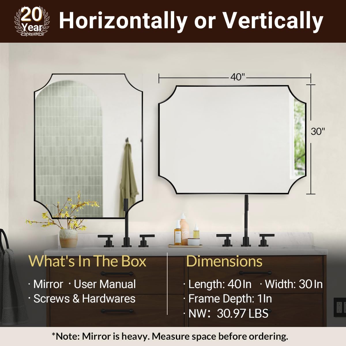- 【Easy and Secure Installation】: 4 pre-installed D-rings, along with all necessary hardware and clear installation instructions, ensure a hassle-free setup process. For any missing hardware, simply reach out to us for prompt assistance. Due to its weight (N.W: 31LBS), we recommend having 2 people install this heavy bathroom vanity mirror